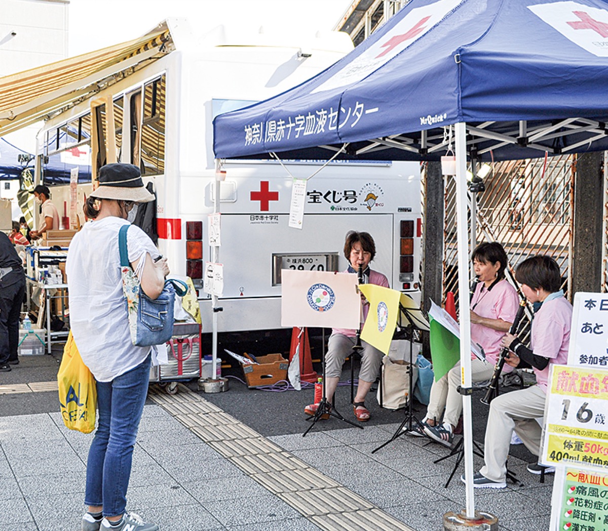 戸塚駅東口で7月、市民演奏家グループがクラリネット演奏会を開いた。横浜戸塚中央ライオンズクラブ(日下部洋史会長/LC)と県赤十字血液センターが行う献血活動に協力したもの。