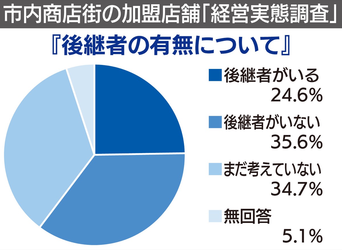 その結果、後継者の有無についての設問では「後継者がいない」が35・6%と最も高く、次いで「まだ考えていない」(34・7%)、「後継者がいる」(24・6%)となっており、全体の3分の1以上の個店で後継者不在という実情が浮き彫りとなった。