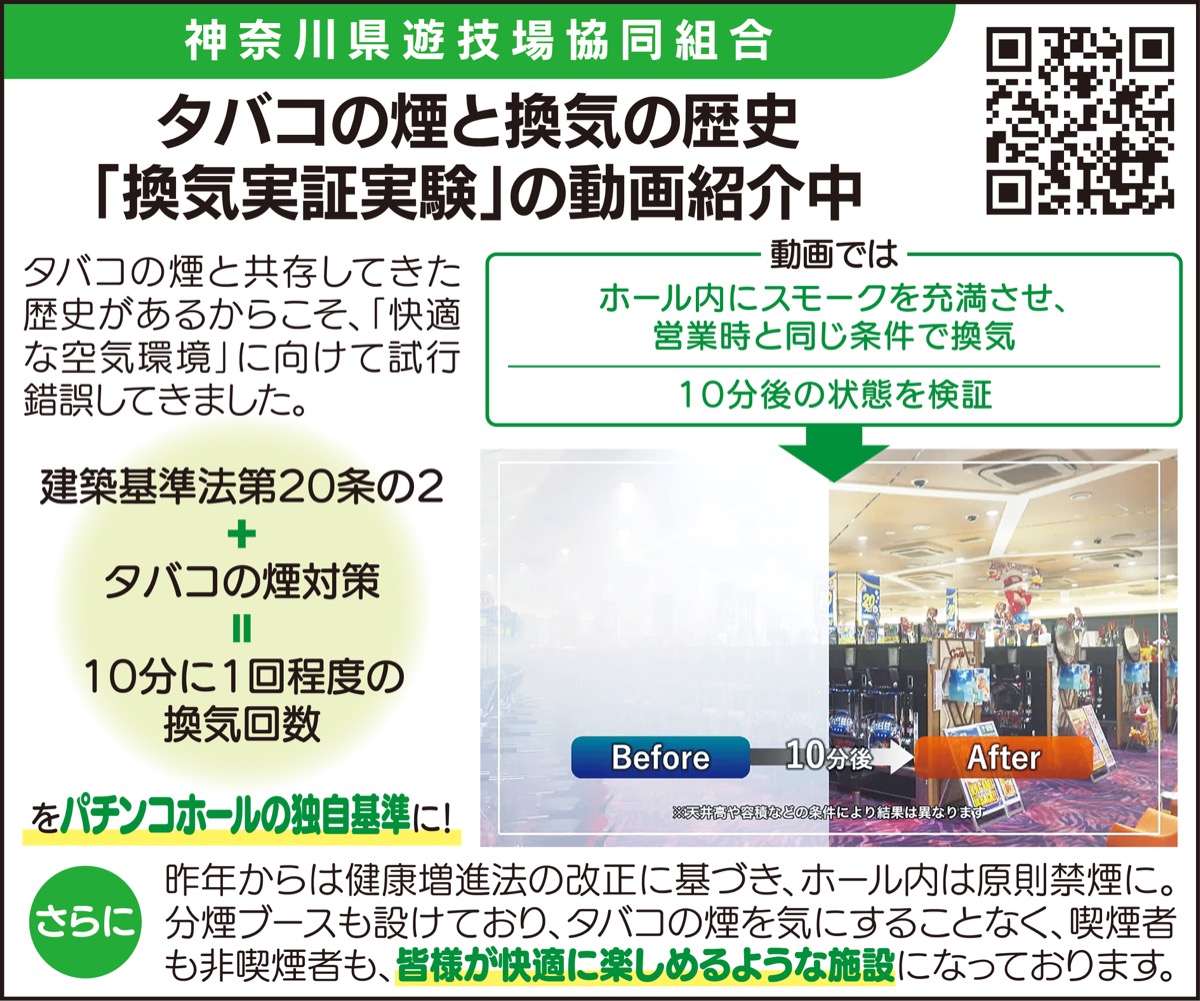 区内最大手のパチンコ店「東横フェスタ」を運営するのは1959年創業の(株)東横商事(戸塚町4790の3/飯島隆史代表取締役)。同社では受動喫煙防止や快適な空間づくりの考えから、コロナ以前から東横フェスタ全店で通常の建築物よりも5倍以上という空調設備を導入している。そもそもパチンコ業界は他の業界に先駆け「施設の換気性能」に着目。所属する神奈川県遊技場協同組合(伊坂重憲理事長)ではYouTubeの「パチンコホールの換気実証実験」動画=左図=を紹介するなど施設での優れた換気性能と安全性を発信。東横フェスタ全店で感染症対策を徹底しながら営業を続けている。