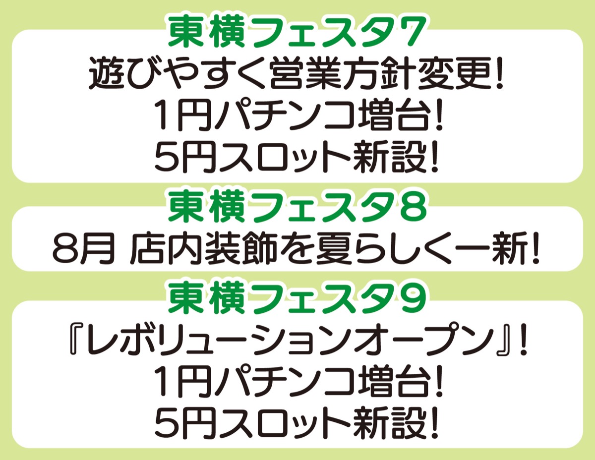 そして今夏東横フェスタ7・8・9で施設環境を変更。7は遊びやすく営業方針を変更、1円パチンコ増台と5円スロットを新設。8は店内装飾を夏らしく一新、9は「レボリューションオープン」で1円パチンコ増台と5円スロットの新設。担当者は「今後も万全の態勢で皆様に楽しさを届けたい」と話している。