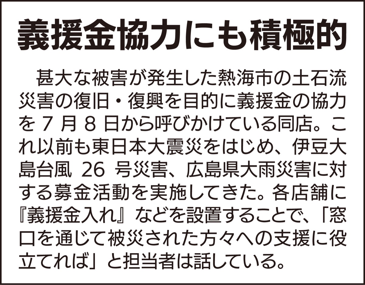 風水害被害が本格化する9月。政府は防災啓発の日として9月1日を防災の日に定めているが、同店でも啓発活動を実施。災害時には一時避難場所としてトイレ貸し出しを行うほか、防災用品の備蓄も行っている。義援金協力も多数で、地域貢献にも熱心だ。