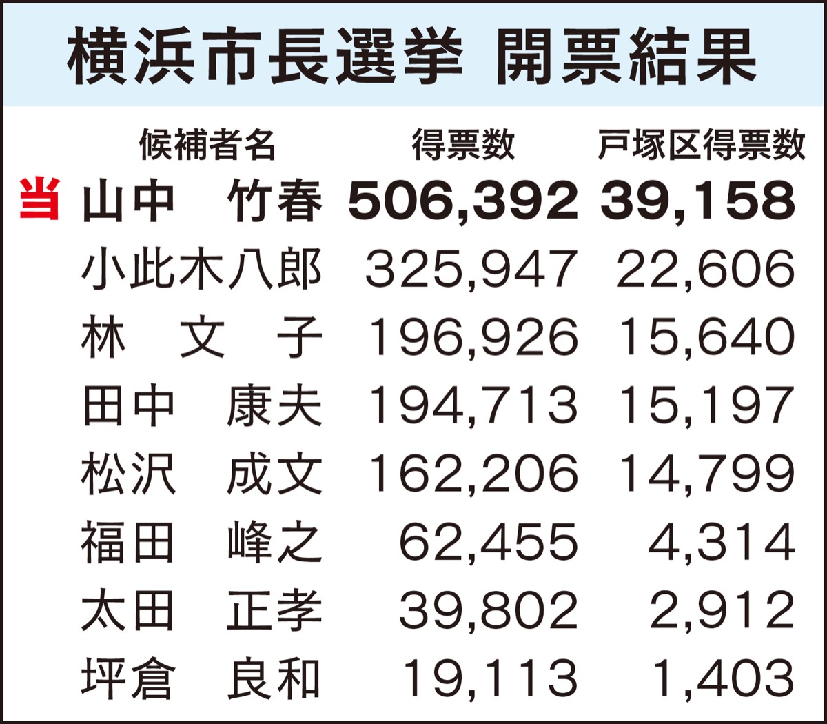 任期満了に伴う横浜市長選挙が8月22日に投開票され、無所属で新人の元横浜市大教授、山中竹春氏(48)=立憲民主党推薦=が約50万票を得て初当選した。過去最多の8人が立候補する中、自民党と公明党が中心に支援した小此木八郎氏(56)や4選を目指した現職の林文子氏(75)らを破り、12年ぶりの市長交代となった。山中氏は争点の一つだった統合型リゾート(IR)誘致に反対しており、市の方針が転換される。投票率は49・05%で前回を11・84ポイント上回った。