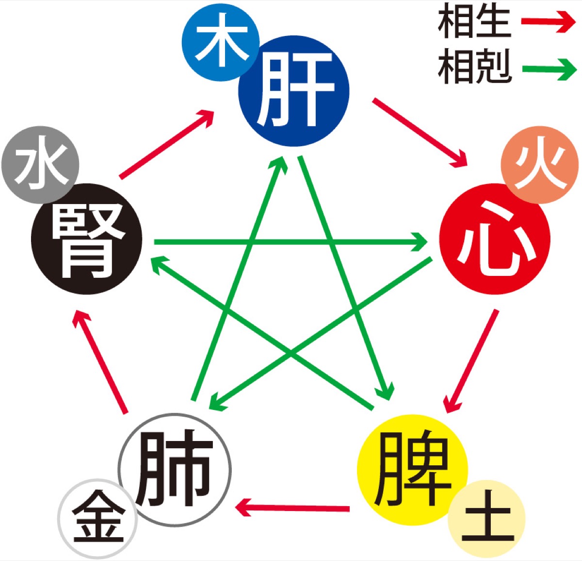 湯川代表によると、「五行」は木・火・土・金・水の五つに分けられ、互いに助け合い(相生)、制約し(相剋)、バランスをとっていると説明。また、地球上の万物を「陰」と「陽」に分けて考え、漢方では人体の「五臓」に対比させるという=表参照。