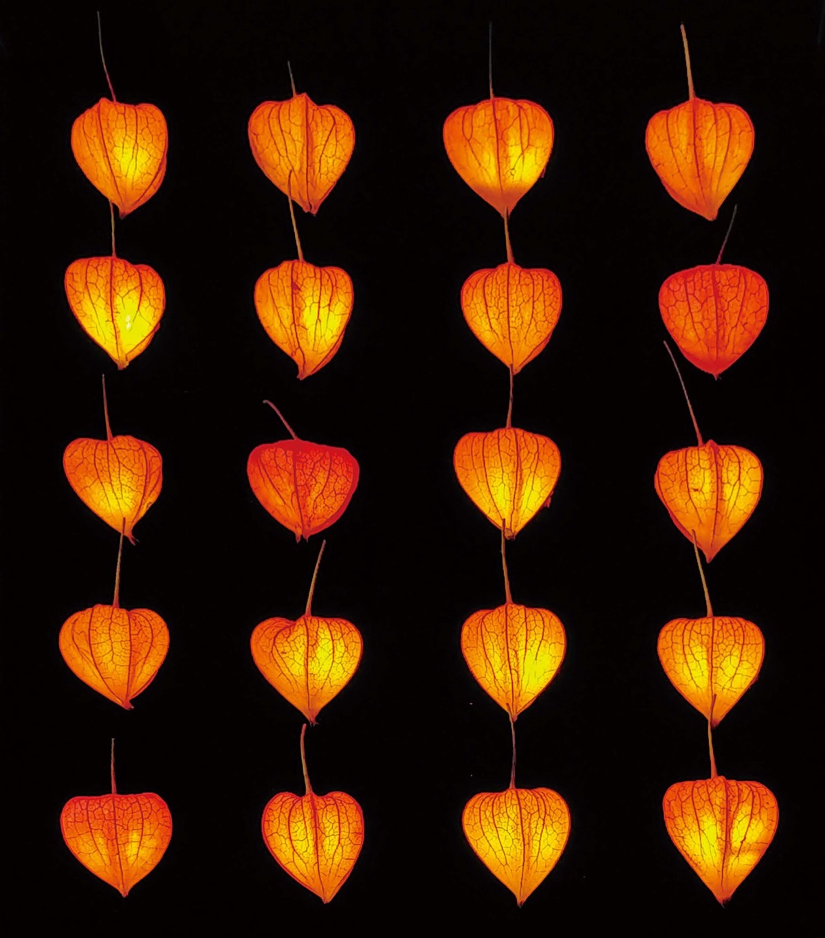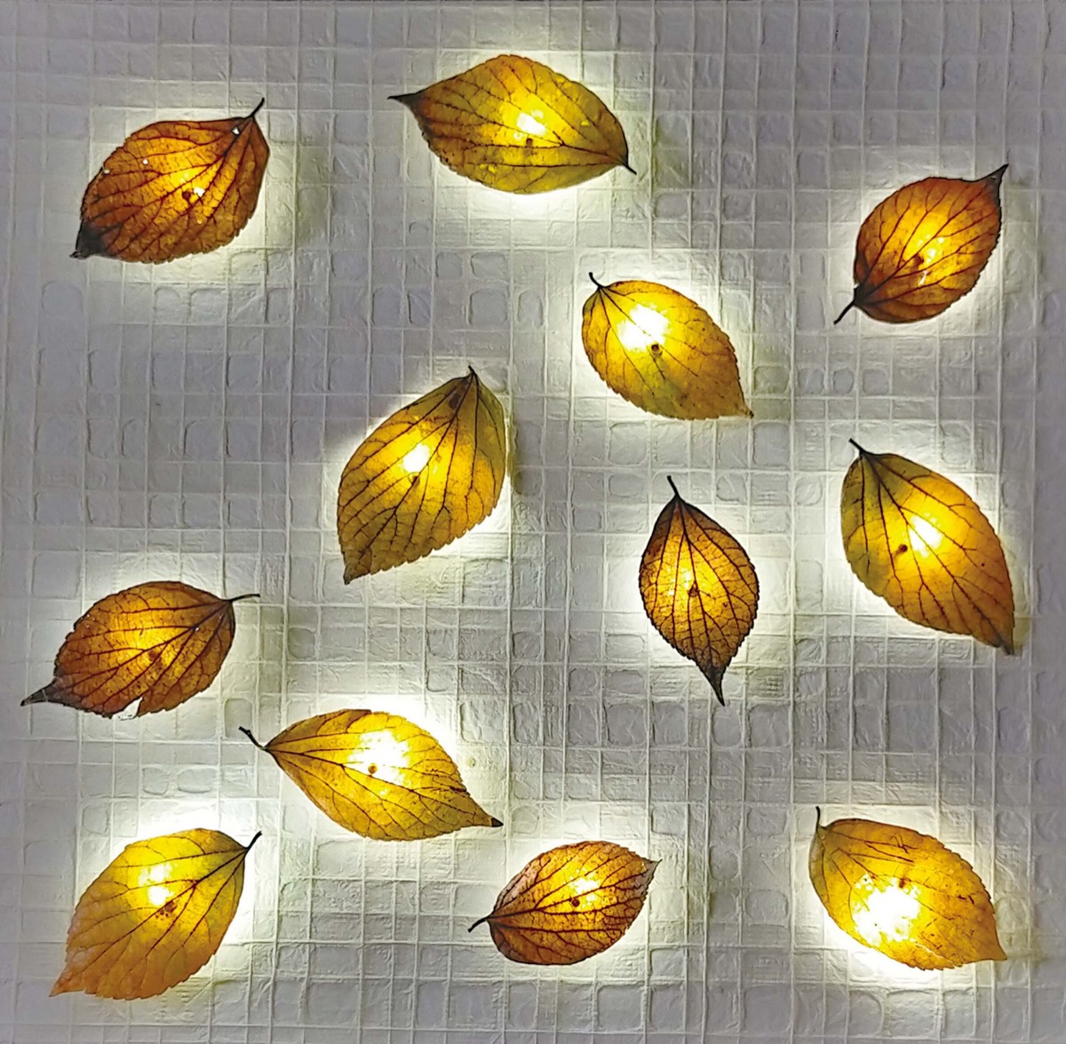 野山で見つけた木の葉や枝、花、実など自然の素材を生かしてアーティスティックな灯りを創っている川村さん。以前住んでいた長野県まで行き、材料を集めを行っているという。見つけた植物には手を加えず、自然の形や色の美しさをそのまま生かし、ひかりで演出している。
