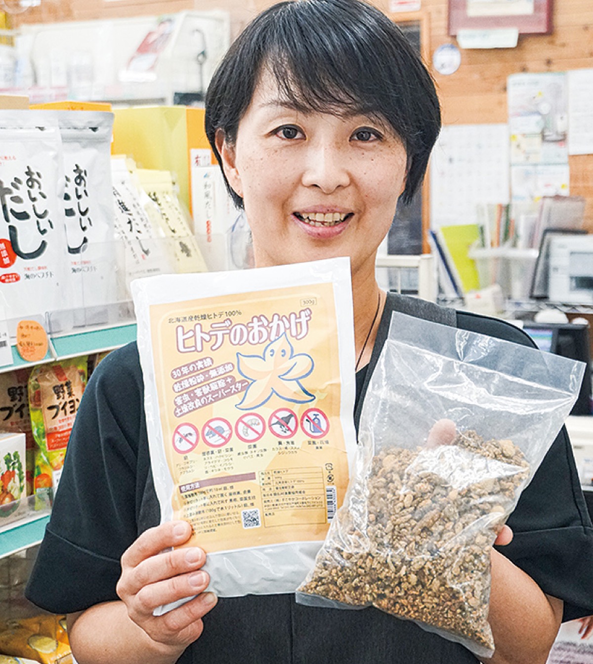 乾燥ヒトデの知恵は、ホタテ産地である北海道の漁協で40年前から活用されている。天敵となるヒトデを駆除して乾燥し動物忌避や土壌改良に役立てている。今年同店が商品化し全国販売。戸塚駅西口のハトフン害対策で反響を呼び8月には2回目の散布が行われた。
