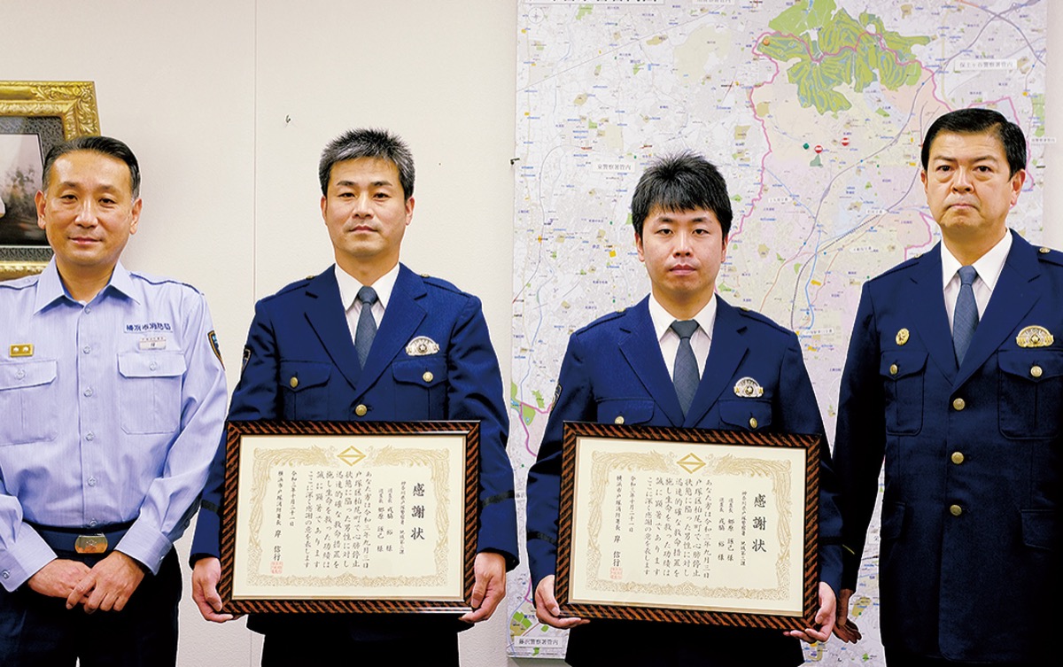 人命救助は9月、柏尾町の不動坂交差点付近を巡回中に行われたもの。道路に停車した車に意識不明者がおり、救急隊が駆け付けるまでの間、AEDなどを活用して心肺蘇生を実施。その後、傷病人は無事意識を取り戻したという。戎脇巡査長は「今回を糧に今後も頑張っていきたい」、郷原巡査長は「冷静に対応できたのが大きかった」と話す。