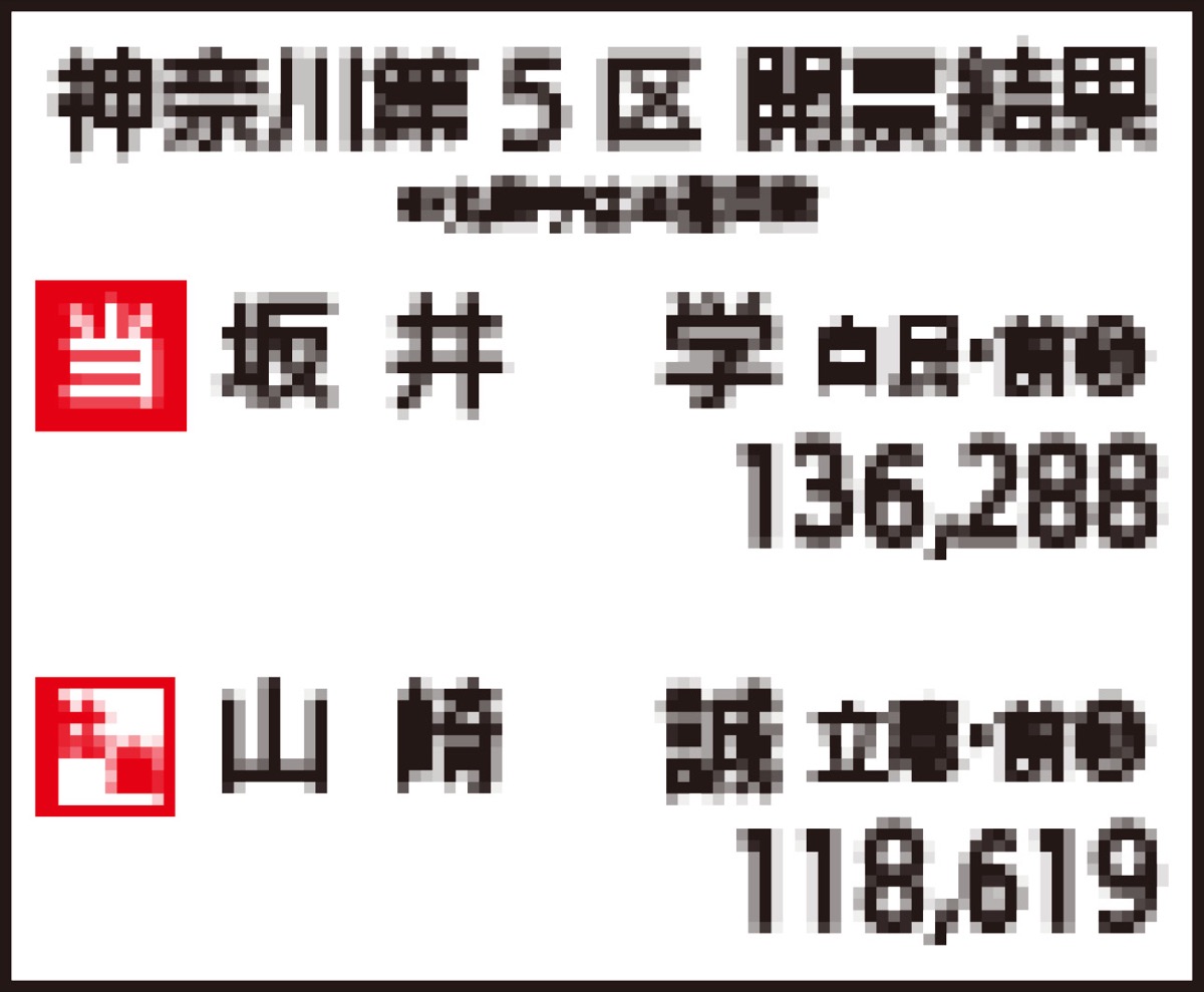 第49回衆議院議員選挙が10月31日に投開票され、神奈川5区(戸塚区・泉区・瀬谷区)では自民党前職の坂井学氏(56)が13万6288票を獲得して当選を果たした。立憲民主党前職の山崎誠氏(58)は11万8619票と及ばなかったものの、比例で復活当選した。【1日起稿】