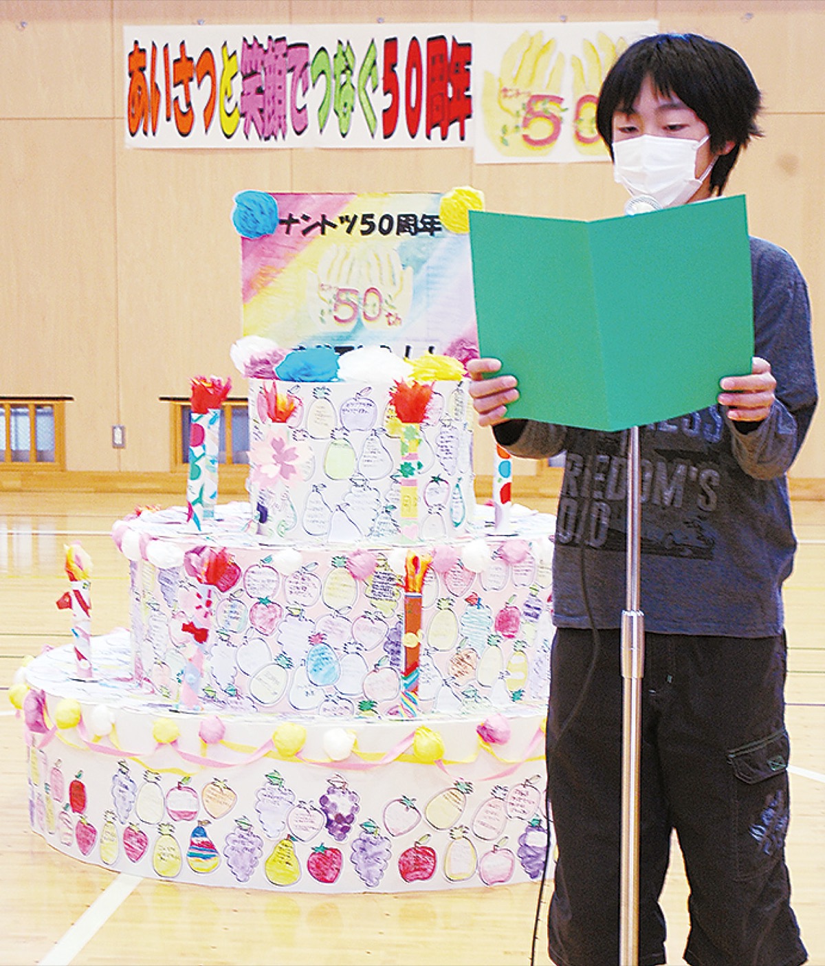 当日は密を避けるためクラス代表や祝う会の実行委員のみ体育館に集まり、クラスの目標を発表しながら、全校児童からのメッセージが貼られる手作りケーキに画用紙のろうそくを飾った。また、50周年を記念して地域密着型シンガーソングライターのkaho*さんによって製作された歌も発表された。