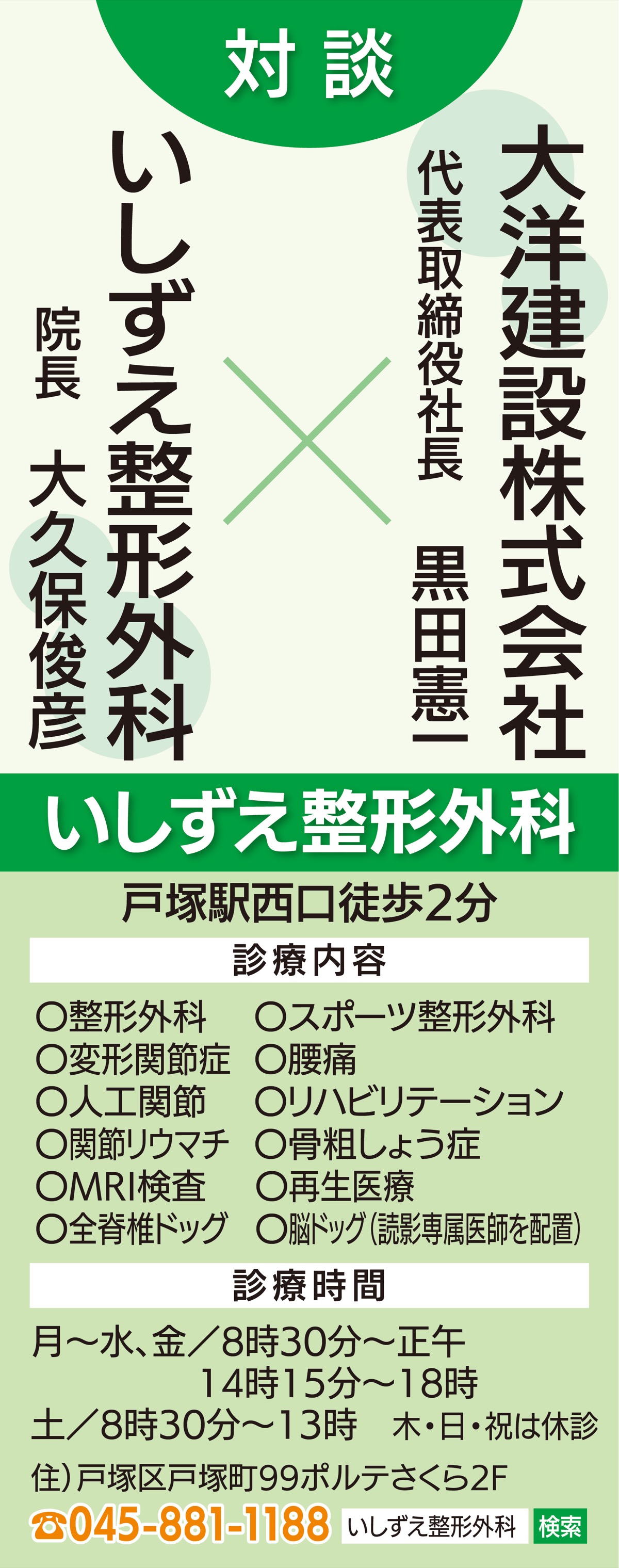 経営学を研究する天本が、戸塚駅近くにある、いしずえ整形外科の大久保俊彦院長と、戸塚区に本社を構える大洋建設(株)の黒田憲一氏の対談を企画しました。「医療」と「建設」。異なる業務に取り組むお二人ですが、地域貢献に熱心な共通点があります。今回、それぞれのお考えを語ってもらいました。