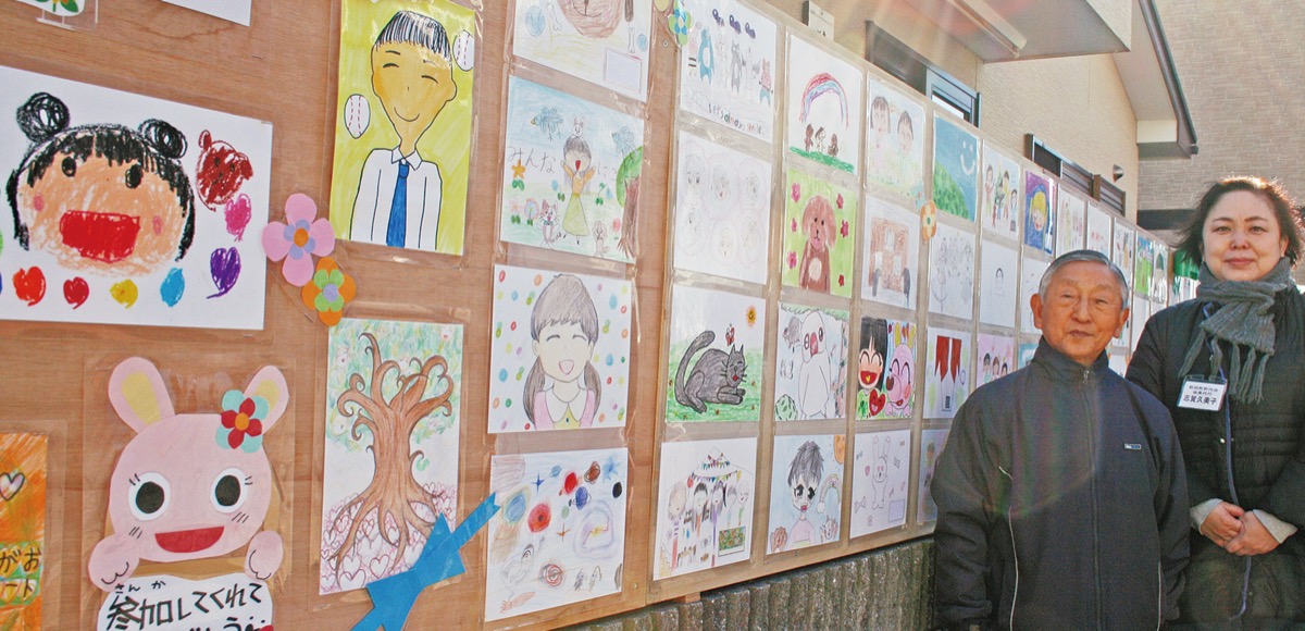 コロナ禍で行事ができないなか、子どもたちに「何か楽しみを」との思いで役員が考案し、昨秋作品を募集、年末から展示が始まった。参加した子どもの一人は「良い思い出になった」とにっこり。高嶋会長は「コロナ禍だこらこそ笑顔が貴重。楽しい絵が並んでいて、町が明るくなる」と嬉しそうに語った。