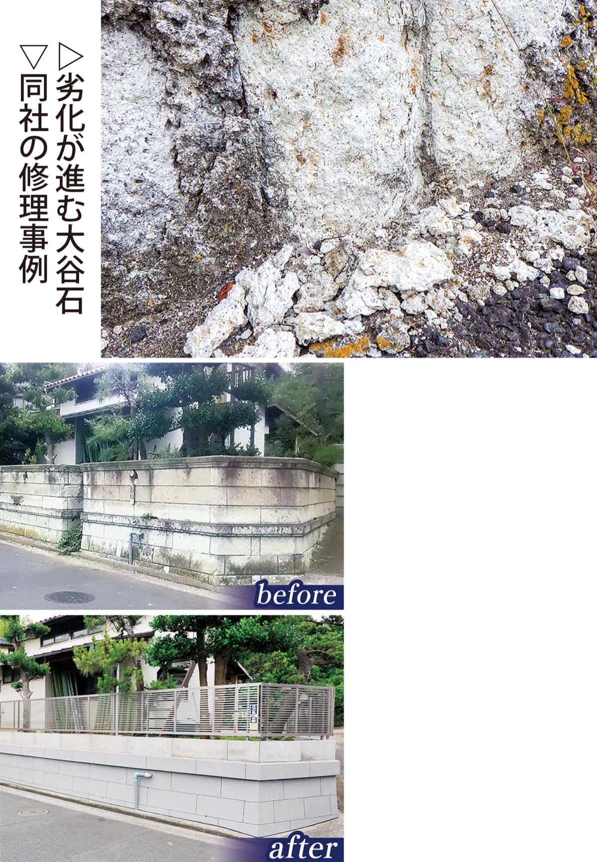耐火性に優れ自然な風合いが日本人になじむため、戦後から昭和50年ごろにかけて石塀などの建材として広く使われてきた大谷石。20、30年が寿命のため、創業90年、市内石工事実績最多の石半では近年相談事を多く受けているという。そこで数年前からは風化が進んだ大谷石を取り換えることなく、補強・再生させる「石塀リフォーム」を始めた。