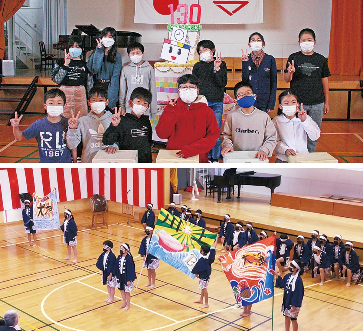川上小学校では21年度、スローガン「つなごう!言葉と えがおと やさしさを みんな かがやけ 130」を掲げた横断幕を作成。昨年4月から全校一致して周年イヤーを祝う準備を進めてきた。昨年夏休み前には全員が立候補した、3年生から5年生各学年から2人、6年生6人の計12人で構成された「創立記念フェスティバル児童実行委員」が結成、11月27日に開かれた「創立130周年記念フェスティバル」の出し物内容などへの会合を重ねてきた。