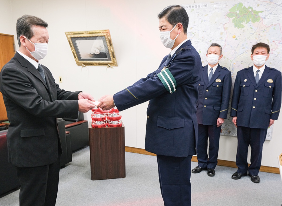 警告灯は交通事故発生時など、警察署員が交通規制をする際に置くパイロンの中に入れて使用。「明るく光るため、運転中の車から見やすく、署員の方が安全に作業ができるよう役立ててもらえれば」と川邊会長は話した。伊藤署長は「署員のことも気遣っていただきありがたい」と礼を述べた。