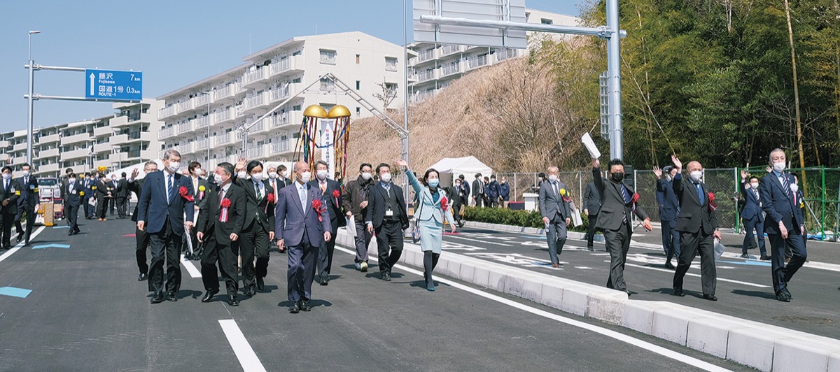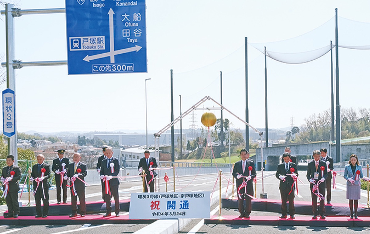 環状3号線の戸塚町日之出橋交差点から、吹上交差点付近の国道1号に接続する開通式が3月24日、行われた。関係者が集まり、テープカットや渡り初め=写真上=などを通して開通を祝った。