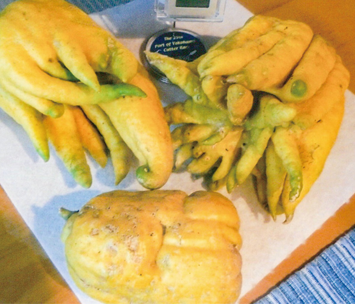 仏手柑は、香り高い果実をつけるミカン科の植物。成長した果実が手の指のような形になり、千手観音を思わせることからこう命名されたという。寺院では生け花として用いられる縁起物。福士さんは「甘く煮て、主菓子としても味わっている」と話す。