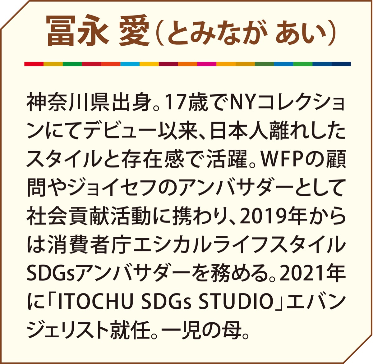 SDGsに対し、私たちはどんな意識を持ち、どう行動することが未来へとつながるのか--。2019年から消費者庁のエシカルライフスタイルSDGsアンバサダーとして活動するモデルの冨永愛さんに、お話をうかがいました。