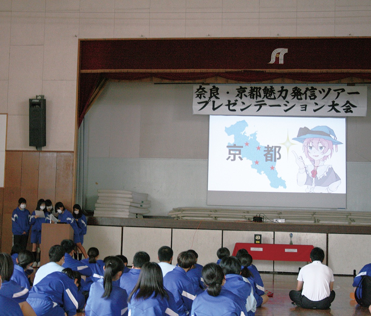 同校で行われたのは「奈良・京都魅力発信ツアープレゼンテーション大会」と題した3年生の修学旅行・成果発表会。学年を27班に分け、生徒による自作のスライドを用いたプレゼン大会と、自ら撮影した写真から優秀作品を選出する「フォトコンテスト表彰」の2つで順位を競った。