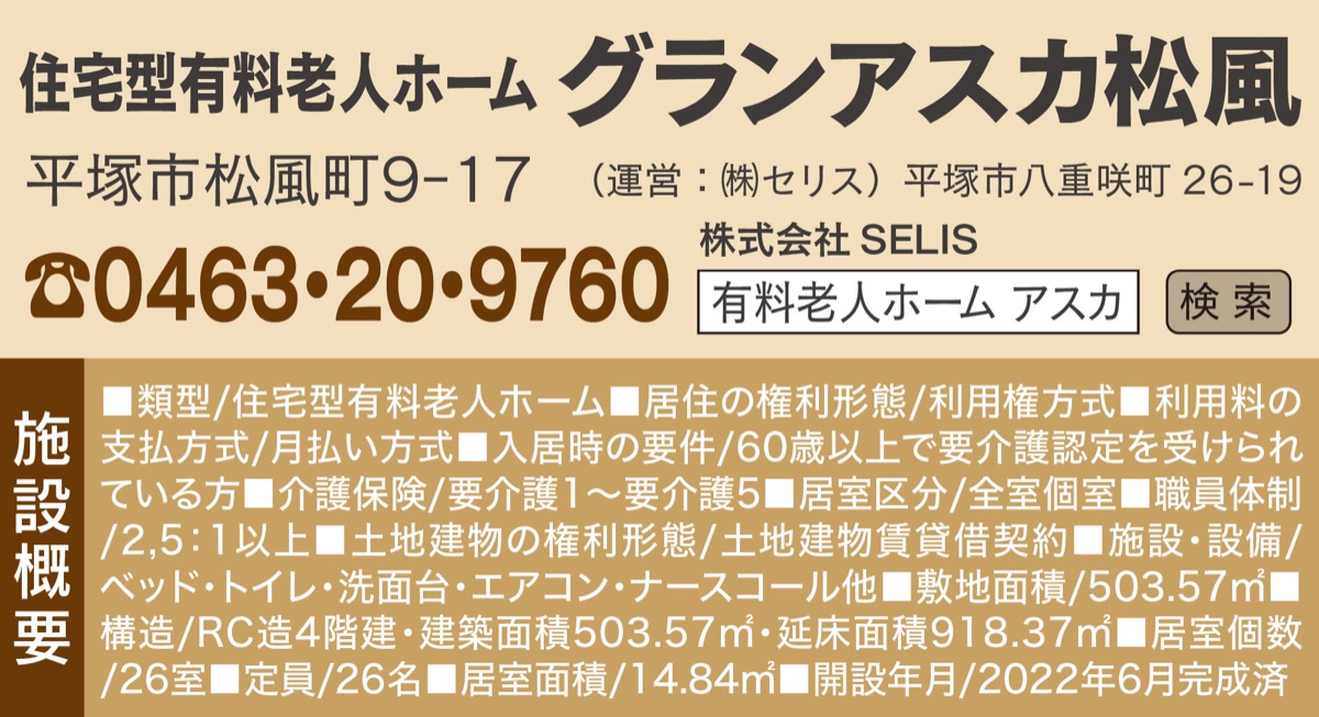 歴史と海風が薫る平塚市松風町に今年5月、住宅型有料老人ホーム「グランアスカ松風」がオープンした。平塚を拠点に全7施設を展開する株式会社セリス(本社・平塚市八重咲町)が運営している。同社の施設はいずれも「低料金と小規模、透明性」が特徴で入居待ちが続いている。八番目の施設として誕生した「グランアスカ松風」は、JR東海道線「平塚駅」南口徒歩8分の閑静な住宅街の一角にある。