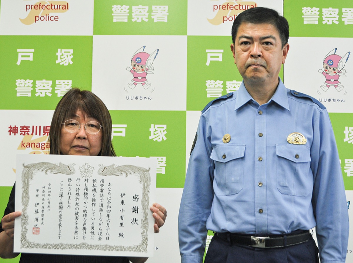 戸塚警察署(伊藤博之署長)で7月5日、特殊詐欺被害を未然に防いだ伊東小有里さん(吉田町在住)の感謝状授与式が行われた。