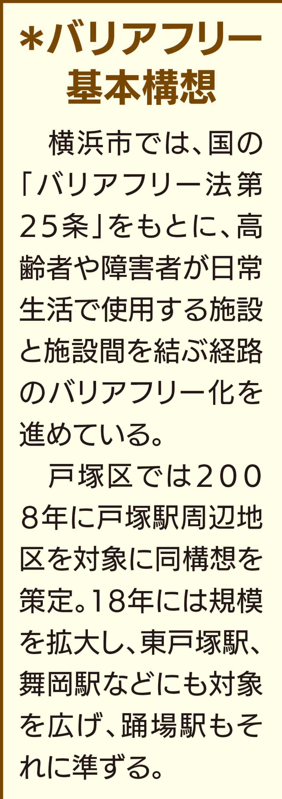 横浜市は2020年から地域住民からの意見を基に検討を重ねてきた、「踊場駅周辺地区バリアフリー基本構想」(*)をこのほど、作成した。今後は市、建物の管理者などが計画をまとめ、27年度までを目標に事業を進める。