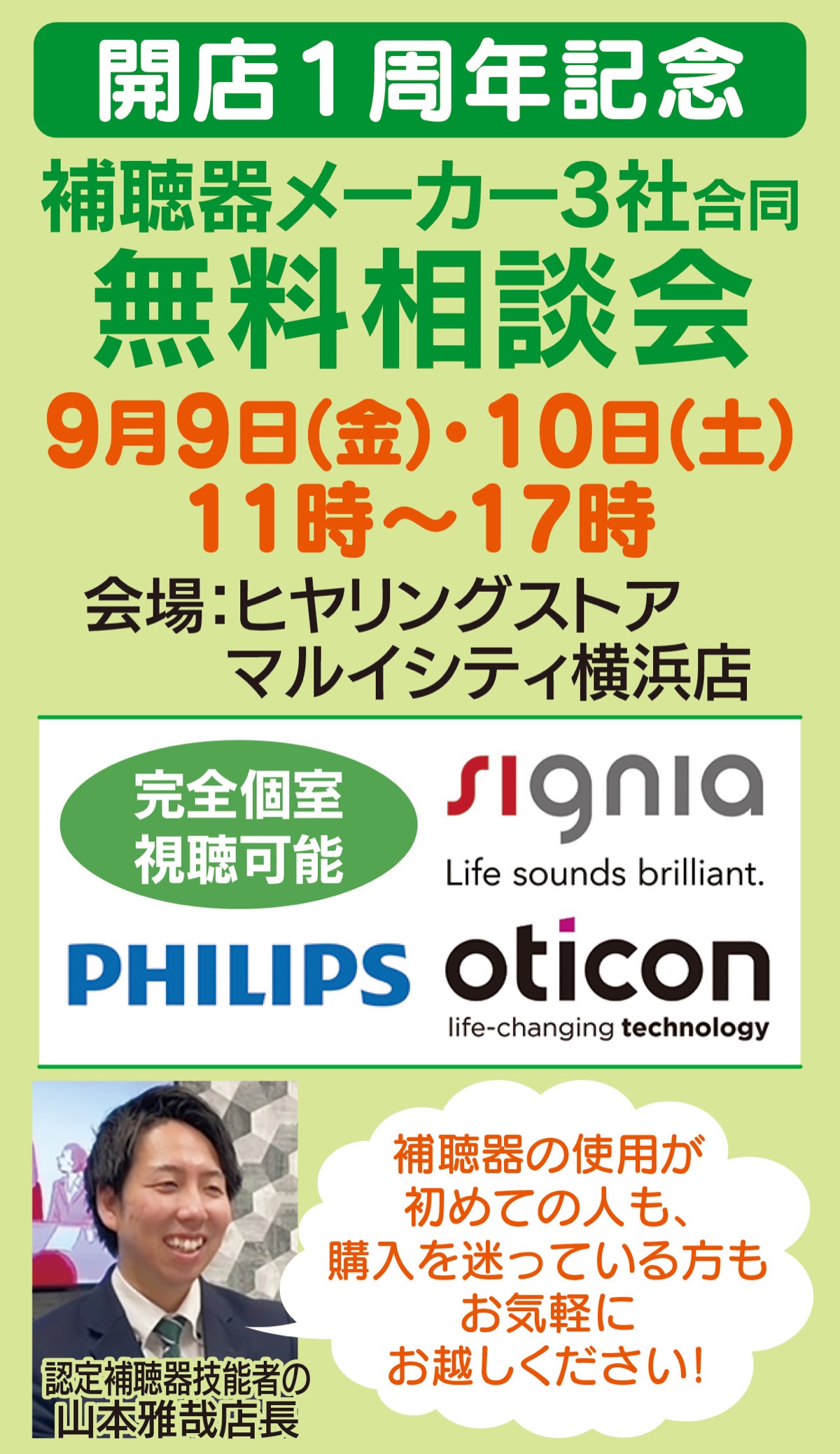 マルイシティ横浜の地下1階に、昨年9月にオープンした小型補聴器専門店「ヒヤリングストア」。開店1周年を記念し9月9日(金)と10日(土)に、メーカー3社が一堂に会する無料相談会を実施する。小型補聴器の世界的メーカーと直接話しが出来る貴重な機会。同店は「聴こえに悩む人や補聴器に不安がある人は、この機会にぜひ相談を」と呼び掛けている。
