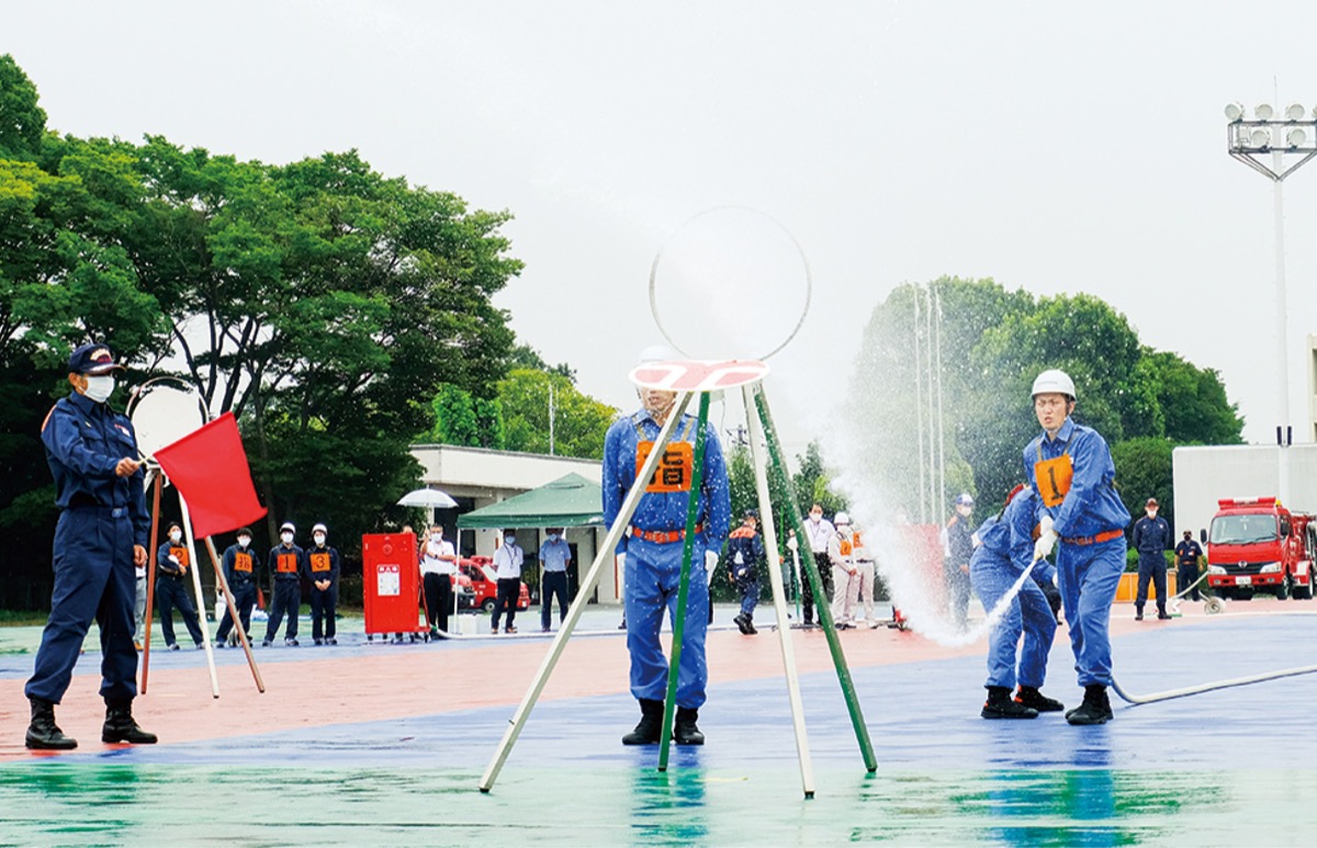 区内工場や医療施設などの事業所が組織する自衛消防隊の技術競技会が8月30日、深谷町の市消防訓練センターで開催された。コロナ禍で3年ぶりの開催。区内7事業所が参加し、消火栓箱から火元に向けた放水までの流れを披露した。