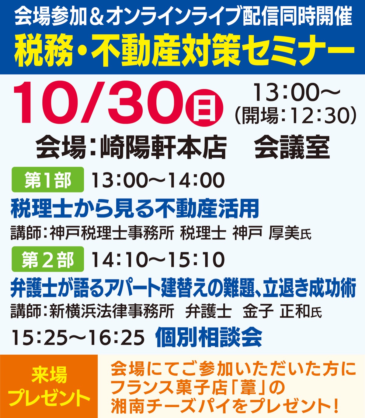 資産活用の様々な悩みを税理士、弁護士が解決してくれる「税務・不動産対策セミナー」が10月30日(日)、午後1時から横浜駅東口徒歩1分の崎陽軒本店 会議室で行われる。参加無料。主催は積水ハウス(株)横浜シャーメゾン支店。