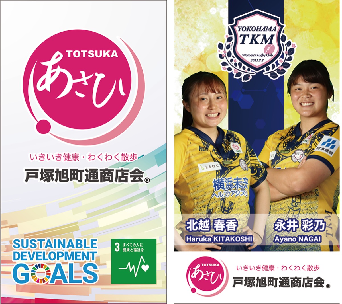 フラッグ片面には、未病を推進する商店会が大切にする「健康」「散歩」の文言、国連で採択された持続可能な開発目標「SDGs」のマークをプリント。もう一面には区内女子スポーツチーム応援の意味を込めて、「YOKOHAMA TKM」(ラグビー)と「ニッパツ横浜FCシーガルズ」(サッカー)の選手2人を掲示。