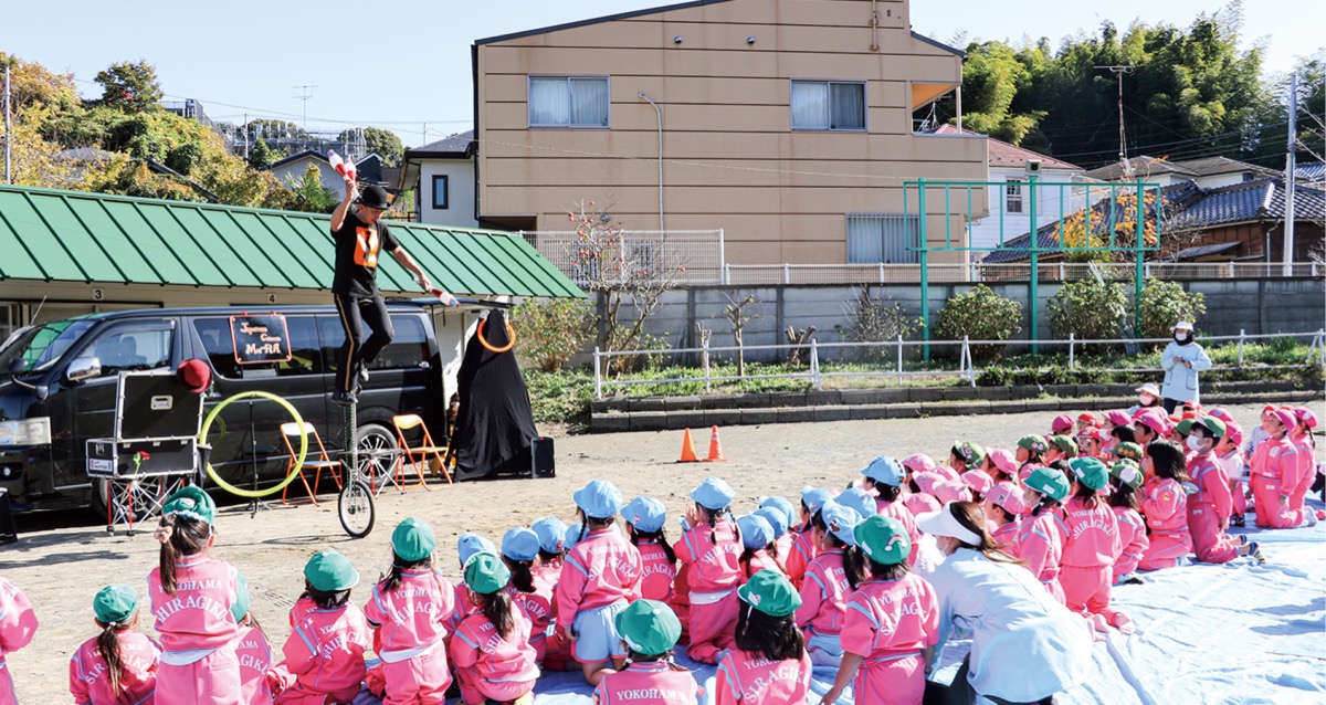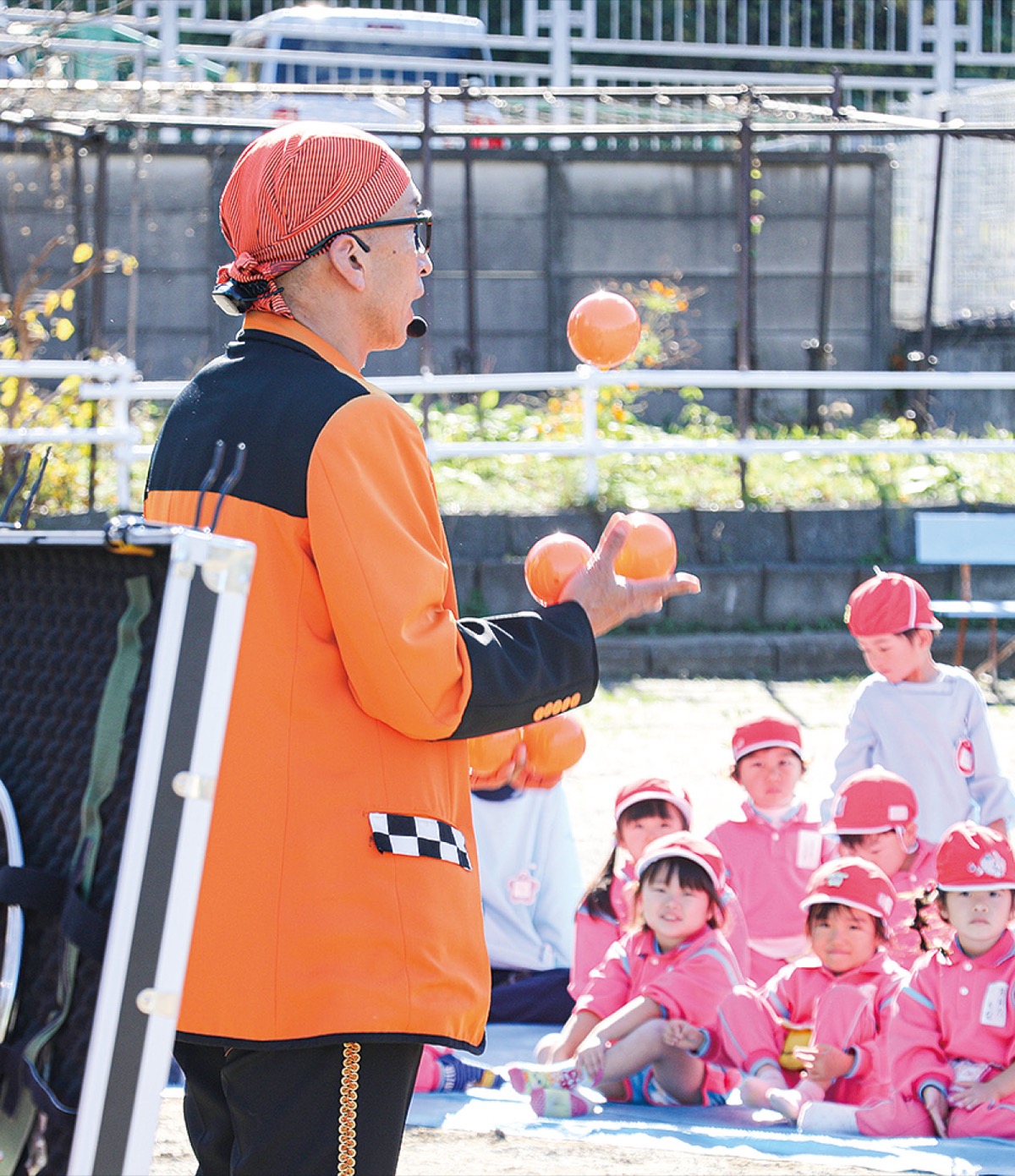 年に一度、同園のグラウンドで行われているもの。今回は園児254人を2グループに分け、『サーカス劇団Mu-RA』さんによるショーが行われました。曲芸師Mu-RAさん・マジシャン南海子さんによるパフォーマンスが披露されると、園児たちの歓声が飛びました。鈴木砂織理事長は「拍手・手拍子であっという間のひとときでした。目の前に広がる楽しい時間。みんなで共感できた宝物がまた一つ増えました」と話していました。