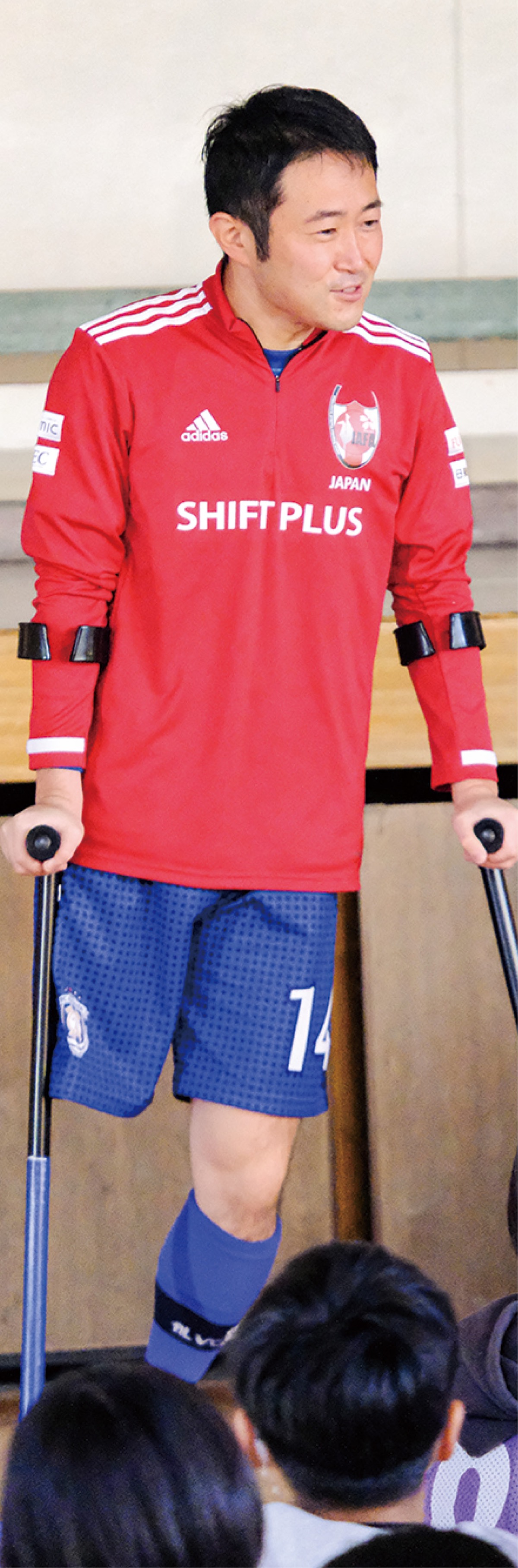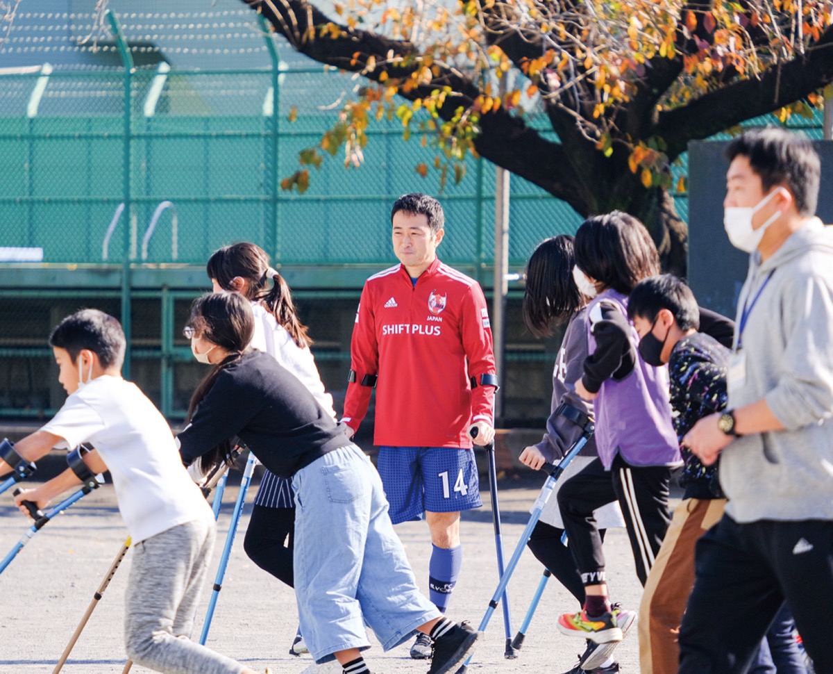 体育館での講演後、実際に医療用杖を身に着け児童らがプレー。遠藤主将は「アンプティサッカーを通じて障害者理解を深めてもらえれば」と語った。神野校長は「互いを尊重しながら頑張る気持ちを学んでほしい」と話した。