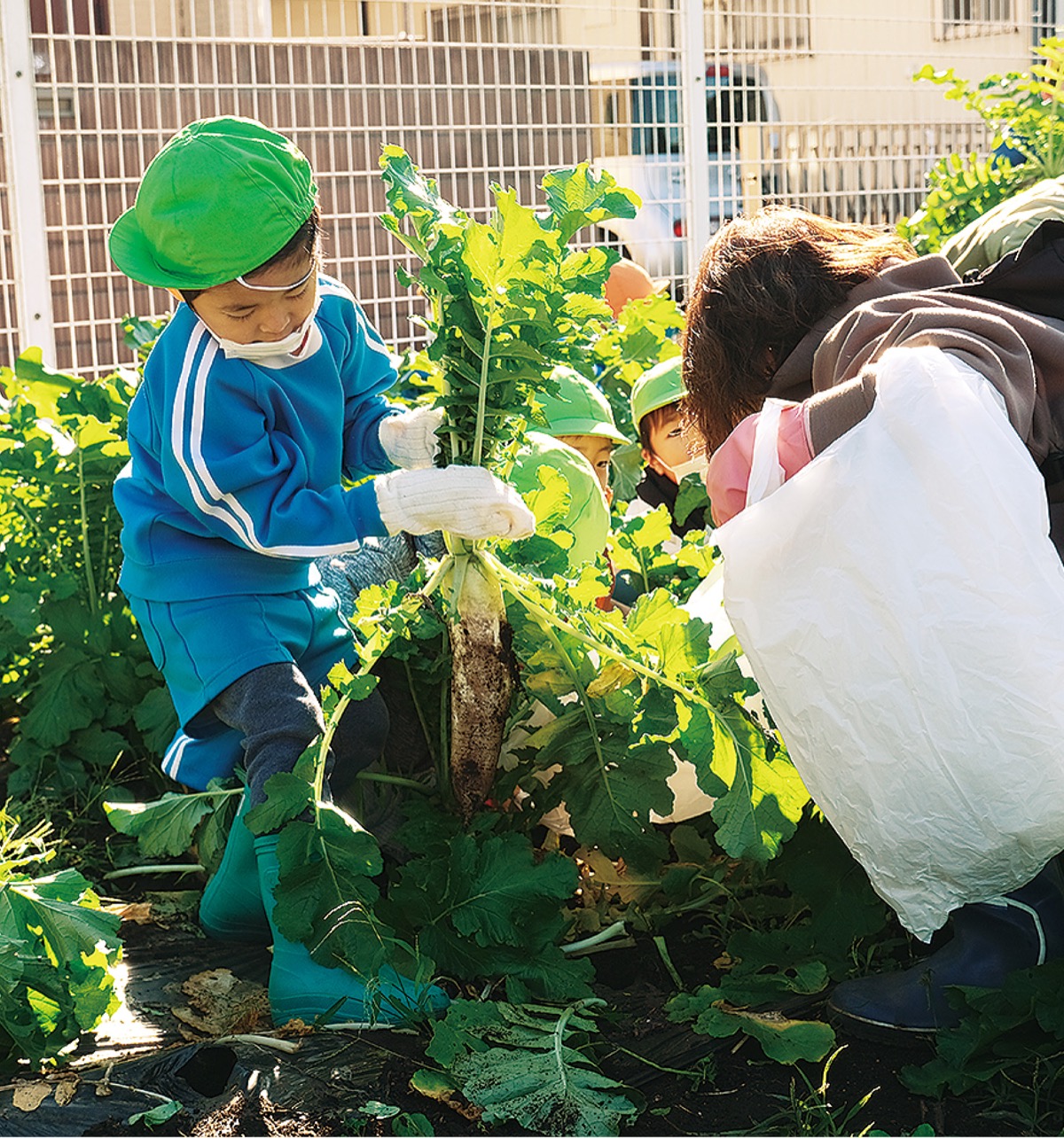 年少から年長までの園児合計150人ほどが、各学年ごとにバスで深谷町の農園に赴き、大根掘りに挑戦。自分たちで種を植えつけていた大根を、「たてたてよこよこまるかいてぽん!」という掛け声とともに力いっぱいに引き抜き、笑顔があふれた。成宮園長は「今年は台風もなく豊作。スーパーであまり見かけない大根の葉っぱも含めて、たくさん食べてもらえれば」と話した。