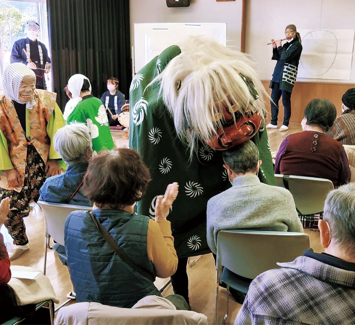同会では見守り対象となる75歳以上の独居高齢者との交流会を毎月開催している。今回は新年を祝う企画として汲澤囃子連に獅子舞を依頼。囃子の演奏と獅子のくるい、子どもたちによるひょっとこ踊りが披露された。最後は獅子が参加者の頭を噛み、今年一年の安泰祈願を行った。石井徹会長は「皆さん大変喜んでくれ、素晴らしい1年のスタートが切れた」と話した。
