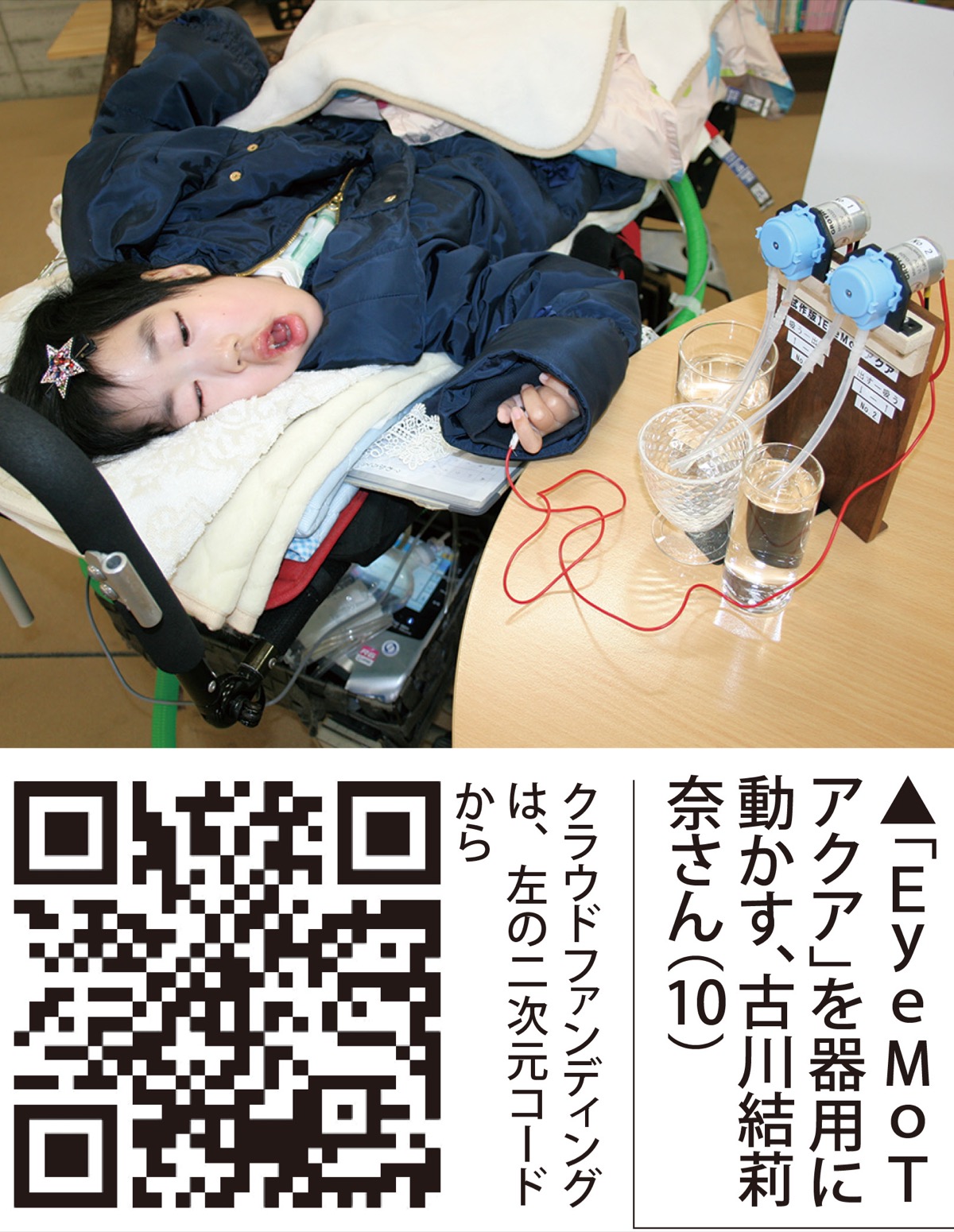 「こどもハッシン!」は液体を吸引し、飲み物作りや実験ができる、「EyeMoT」を活用した新装置「アクア」(写真参照)を使い、崎陽軒のシウマイにかけるタレを作成する。子どもたちは自身の考えで押しボタンや視線入力で調味料を配合し、提供する側に回る。イベントリーダーの古川綾子さんは「シウマイにかけるタレを作る子どもたちにとって初めての料理作り。クラウドファンディングへのご協力を」と話す。