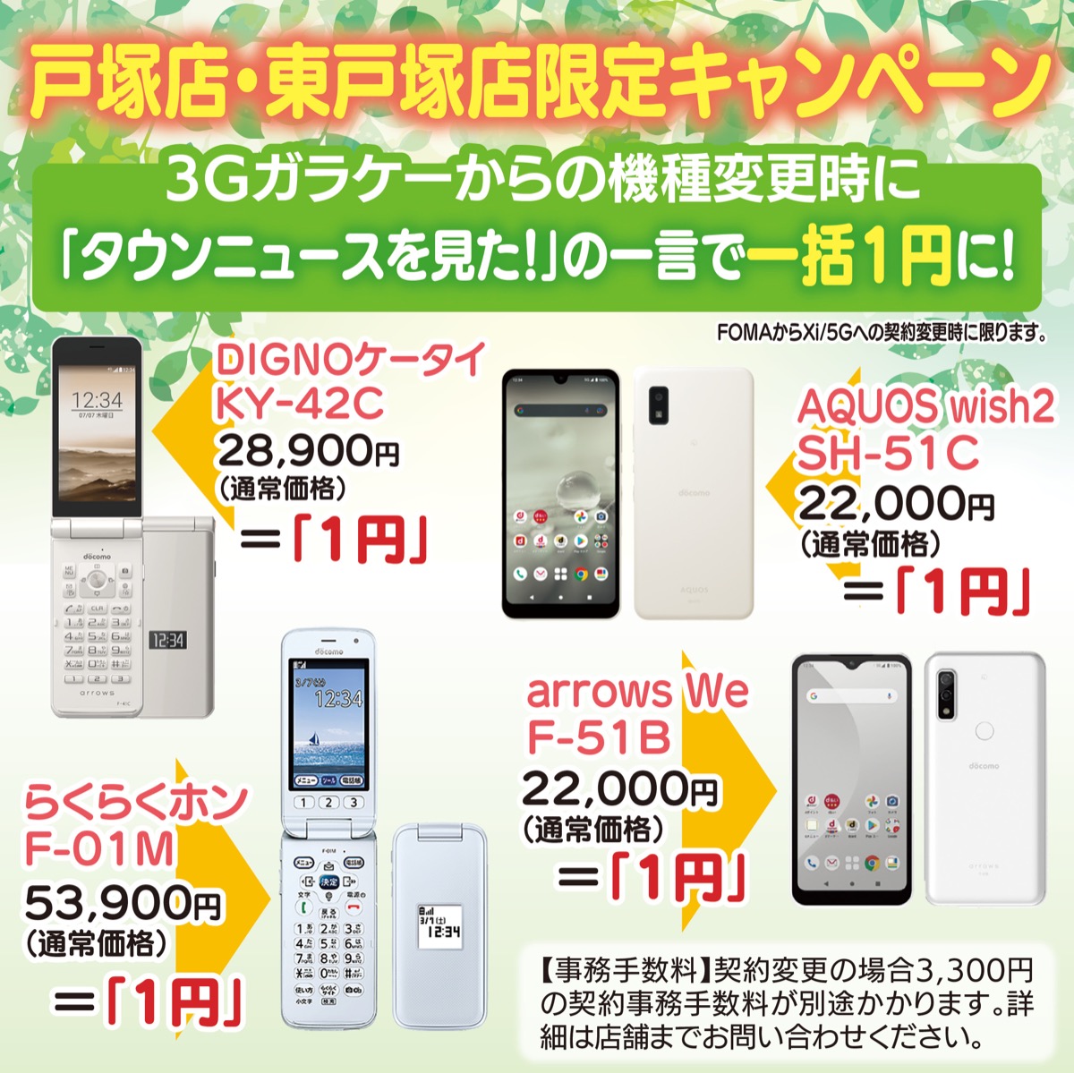 ドコモショップ戸塚店・東戸塚店では、3Gガラケーからの機種変更時に「タウンニュースを見た」で、3G電波終了後も使用できるスマホ「arrowsWe」などが本体一括「1円」に。シニアに人気の折りたたみ携帯「らくらくホン」もキャンペーン対象。人気機種を通常価格の半額以下で手に入れられるチャンスだ(台数限りで販売終了)。
