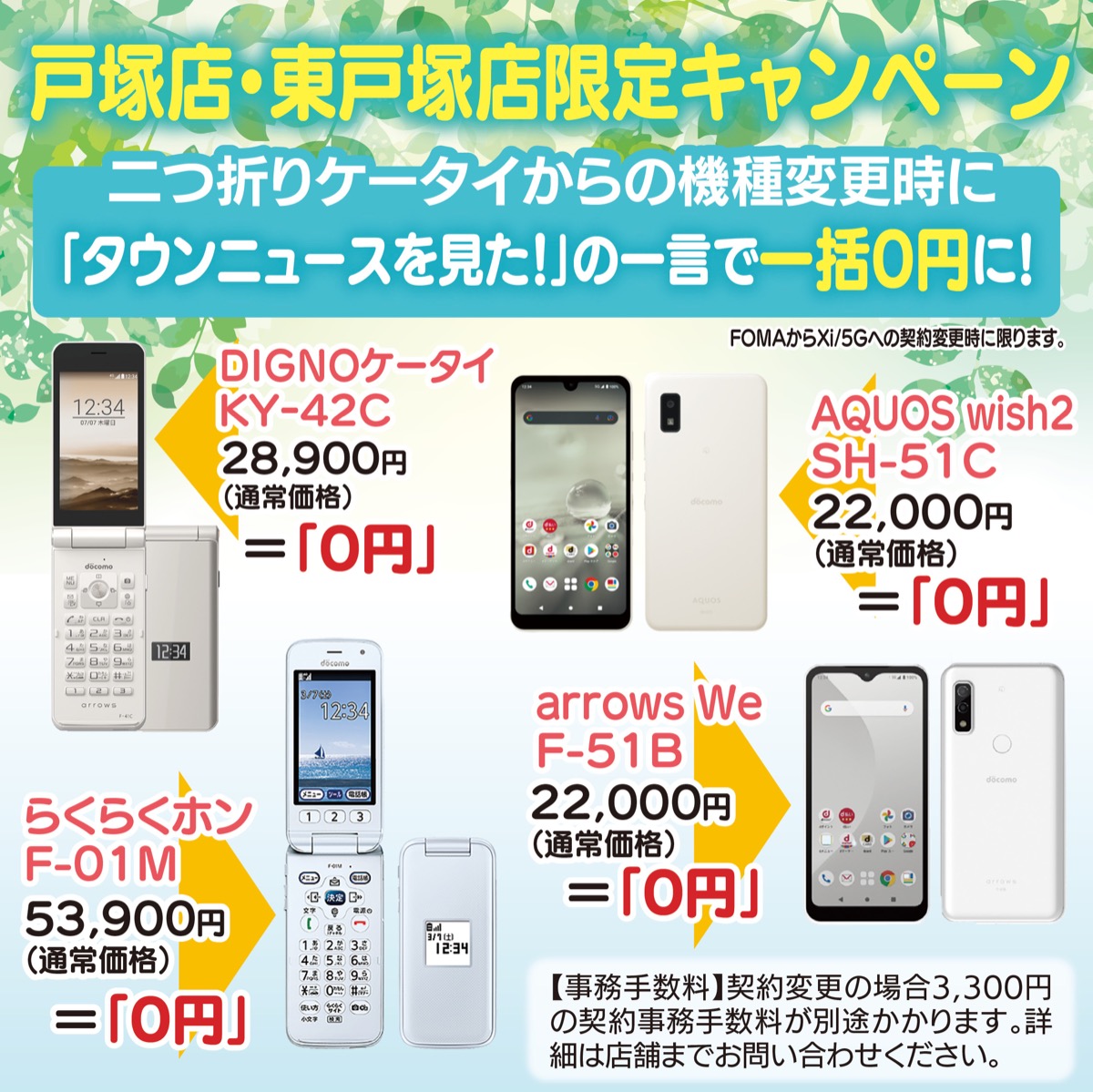 ドコモショップ戸塚店・東戸塚店では、3G二つ折りケータイからの機種変更時に「タウンニュースを見た」で、3G電波終了後も使用できる、馴染みの折りたたみ式タイプの新機種「DIGNOケータイ」やスマホ「arrowsWe」などが本体一括「0円」で手に入る(写真参照/売り切れ次第終了)。
