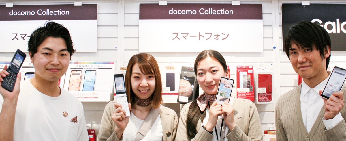 「二つ折りタイプの機種『ガラホ』はスマホ電波で今後も使用できます」と両店スタッフ。シニアに嬉しいスマホ初心者向け教室開催など各種サポートも充実の両店。気軽に問い合わせを(来店は要予約)。