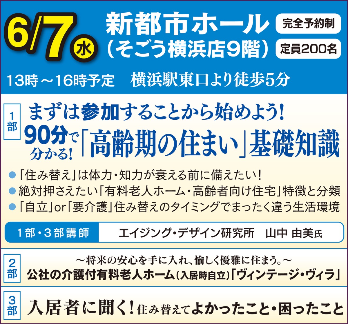 そこで今回のセミナーは「高齢期の住み替え」を検討する時期等に触れながら、複雑化する高齢者向け住宅を講師がわかりやすく解説。また住み替え時の身体状況によって変わる将来の生活環境も説明する。第三部では公社が事業主の「ヴィンテージ・ヴィラ(入居一時金2330・9万円〜)」の入居者に住み替えてよかった点、困った点として生の声を聞く。将来への備えの第一歩としてぜひ参加を。
