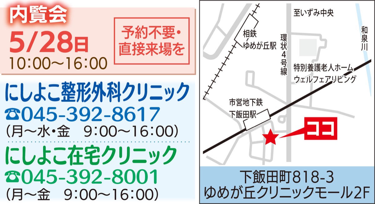 市営地下鉄下飯田駅目の前で6月1日、西横浜国際総合病院の新拠点「にしよこ整形外科クリニック」「にしよこ在宅クリニック」の2院が開院する。それに伴い5月28日(日)に内覧会を開催。予約不要。午前10時から午後4時。直接来場を。