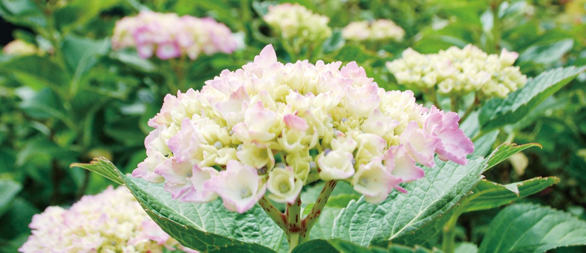 俣野別邸庭園には4種類、180本のアジサイがあり、ガクアジサイは6月初旬、セイヨウアジサイは6月中旬が見頃。アメリカ原産のアナべルは「装飾花」と呼ばれる花のように見える部分が緑色になり7月頃まで楽しめる。