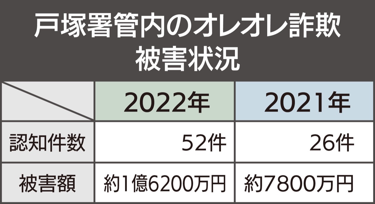 戸塚警察署管内は2022年、オレオレ詐欺認知件数、被害額ともに県下ワースト1位だったことを受け、対策強化に乗り出している。警察主導ではなく、地域住民と協働しながら、撲滅を目指す考えだ。