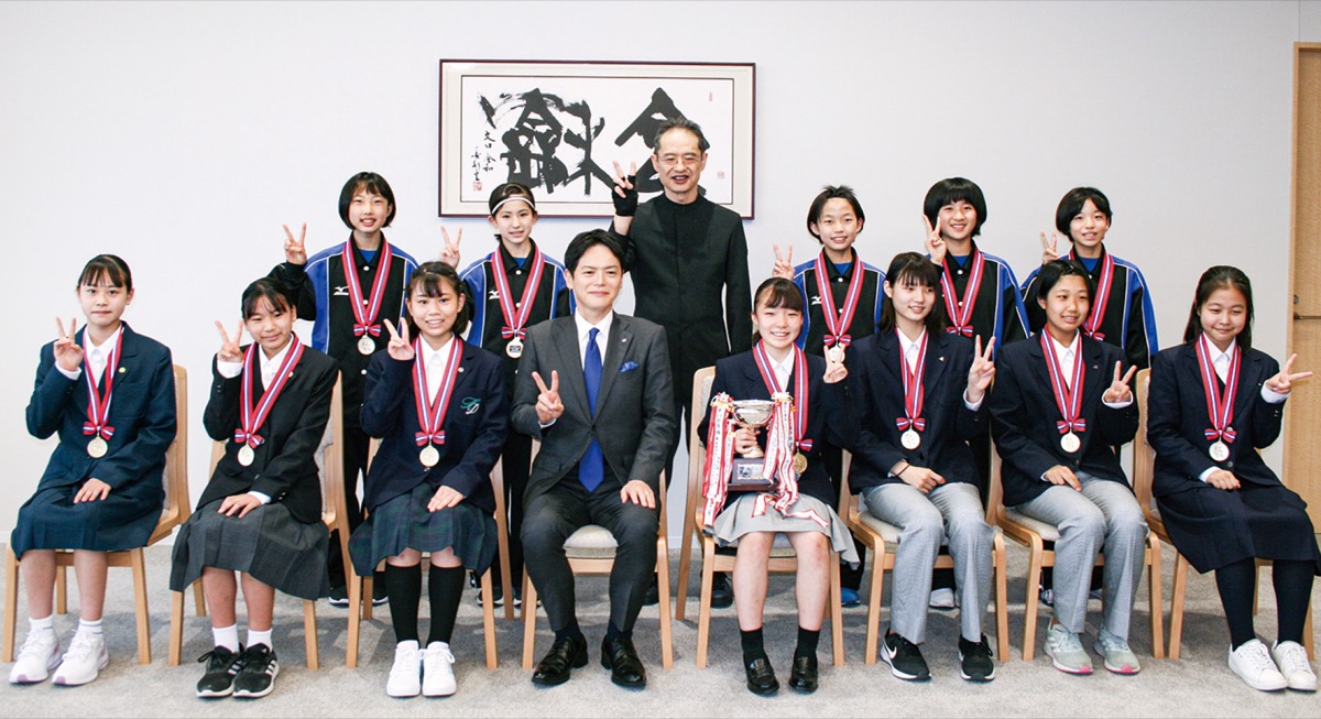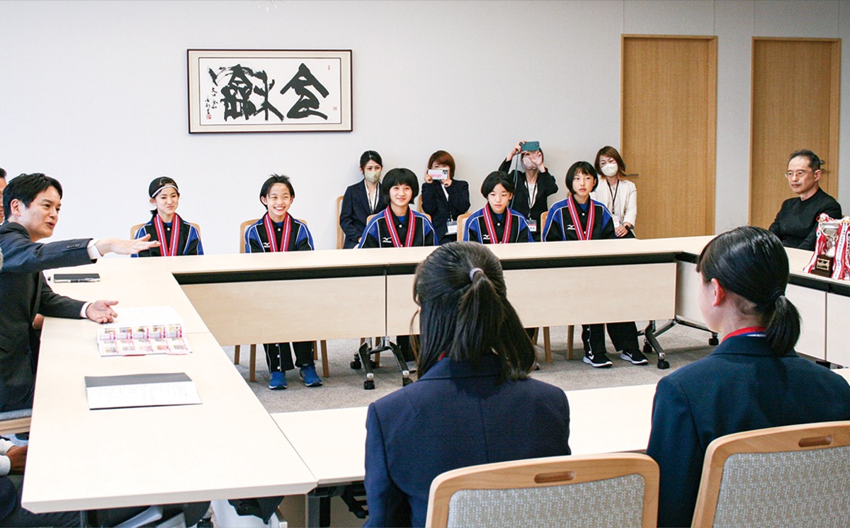 市長は「3戦全勝、素晴らしい活躍でした。どんな大会でしたか」と質問を投げかけた。大会当時、キャプテンを務めていた飯塚うららさんは「みんなが強くなったことを感じられた。試合中も声を出して、今までの成果を発揮できました」と報告した。