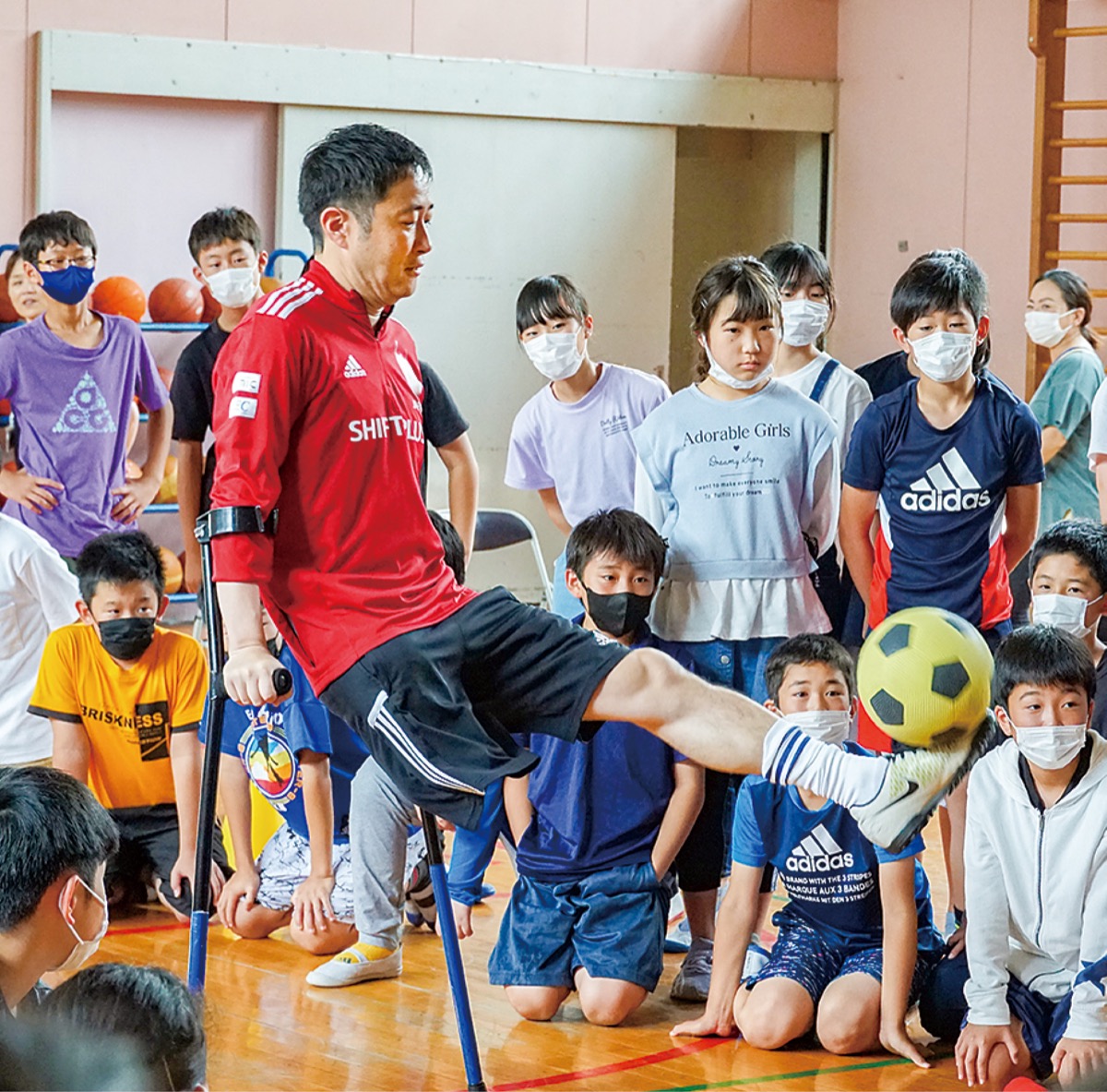 区内出身の遠藤さんは、3年前から同校の学校薬剤師を務めている縁もあり登壇。講演では、小学生の頃から11年続けてきたサッカーを、バイク事故で右足を失ったことで諦めたこと。だが35歳の時、医療用の杖を使って行う同競技を知り、仲間と出会って世界大会で活躍するまでに人生が変わったことなどをスライドで紹介。遠藤さんは「好きなことに取り組もう。やってダメでも経験になる」などと語りかけた。児童からは「片足でするサッカーで辛いと思ったことは」「大会で苦戦した国は」など沢山の質問が寄せられた。