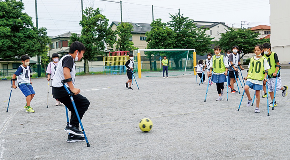 講演後、6年生は校庭で体験授業に参加。両手に杖を持って走ったりした後、チームに分かれて試合も。片足でボールを運んで蹴ることに慣れないながらもルールを理解し、汗を流していた。