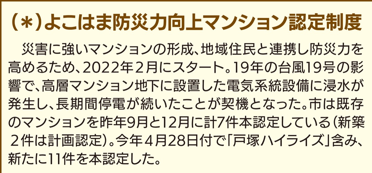 上倉田町のマンション・戸塚ハイライズ(1984年竣工。地上11階・4棟全400戸)が、防災対策に取り組むマンションを横浜市が認定する「よこはま防災力向上マンション認定制度」(*)の「ソフト認定」を取得し、このほど市から認定証が授与された。