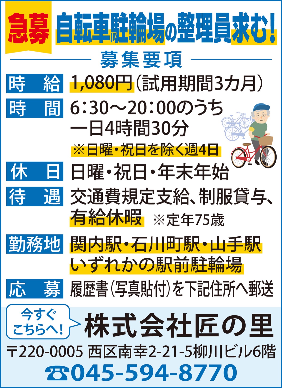 横浜市営の駐輪場管理を受託する(株)匠の里が現在、業務拡大のため一緒に働く仲間(パート)を募集している。関内・石川町・山手各駅前の市営自転車駐輪場管理の仕事。一日4時間半、週4勤務OKと、人気の求人だ。