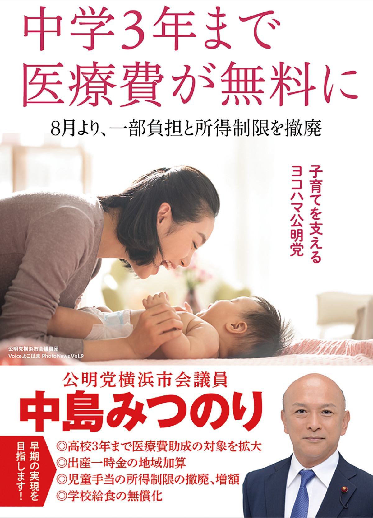 小児医療費無料は、私たちが、何としても実現させたい政策の柱として強力に推進してきたもの。振り返ると、今から約30年前の1992年、横浜市会で初めて、3歳未満児までの医療費無料化を提案したのが始まりです。これを契機に95年の0歳児の入院・通院助成がスタート、徐々に通院助成の対象年齢の拡大が進んできました。2017年に小6まで、19年に中3までへ。そして今年8月、所得制限・一部負担金が撤廃され、市内の中3までの医療費が全額助成されます。
