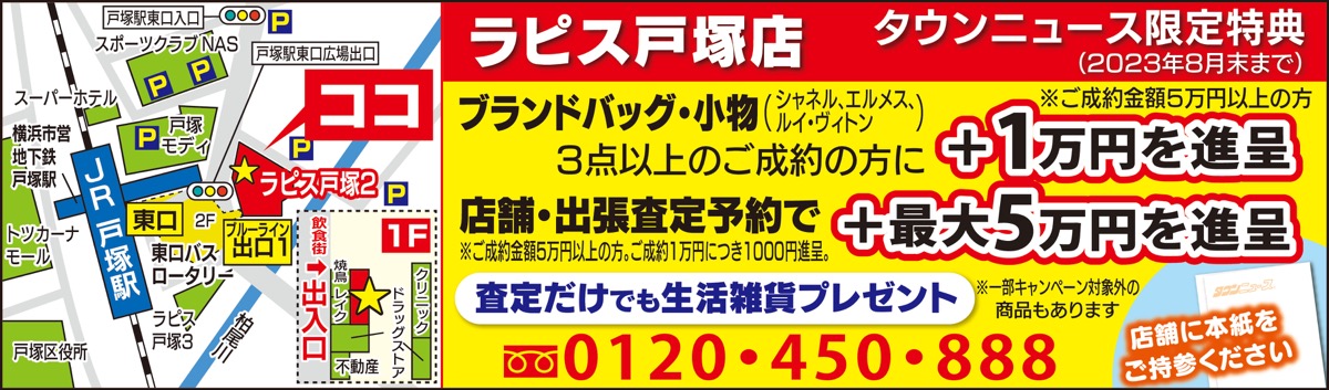 今年も異常な暑さを記録しており、この時期の外出は控えたいという人には、自宅で査定から買取までが完結する同店の出張サービスが便利。「地域密着をモットーに、ラピス戸塚店で接客するスタッフが伺います。ご自宅でおたからや品質の査定を受けられますので安心です」。