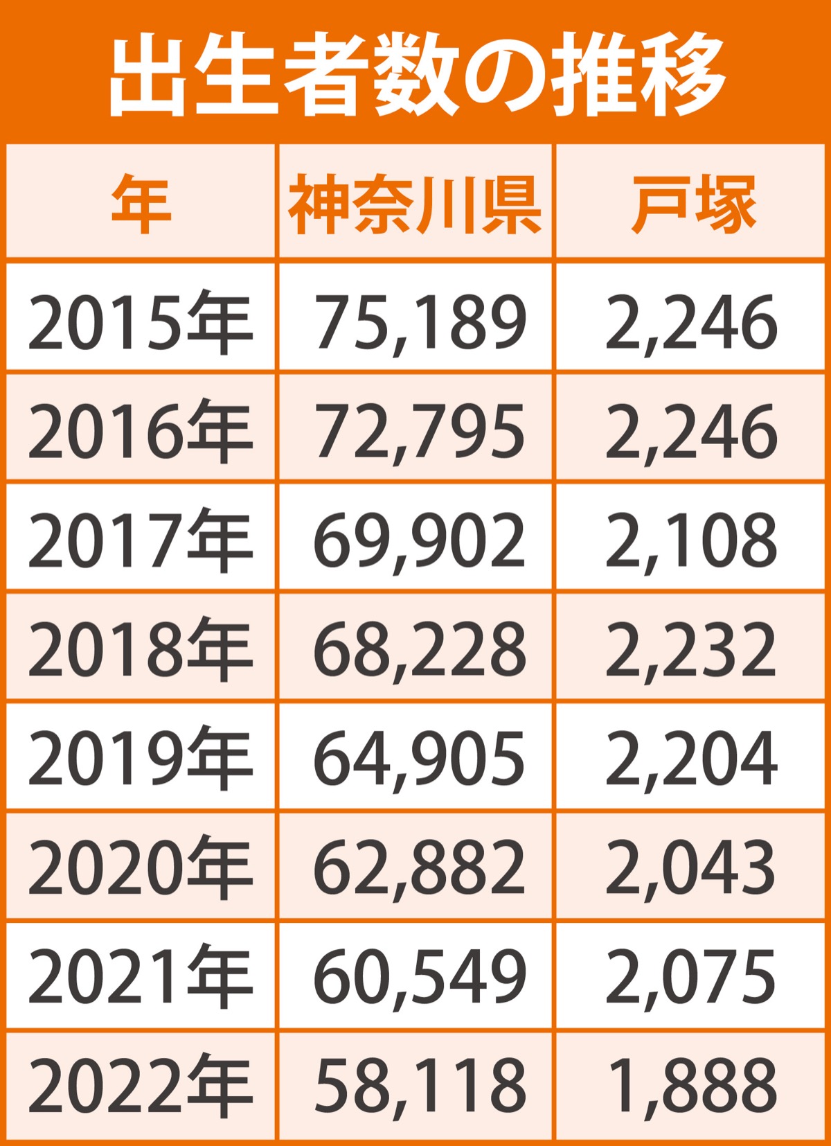 県の出生者数は5万8118人。前年から2431人減少し、61年ぶりに6万人を下回る結果となった。戸塚区の出生者数は1888人。県内58の市区町村の中で6番目、横浜市内で4番目に多かった。出生者数が2000人を下回るのは、神奈川県のHPでさかのぼることができる2001年からのデータで初めてのこと。