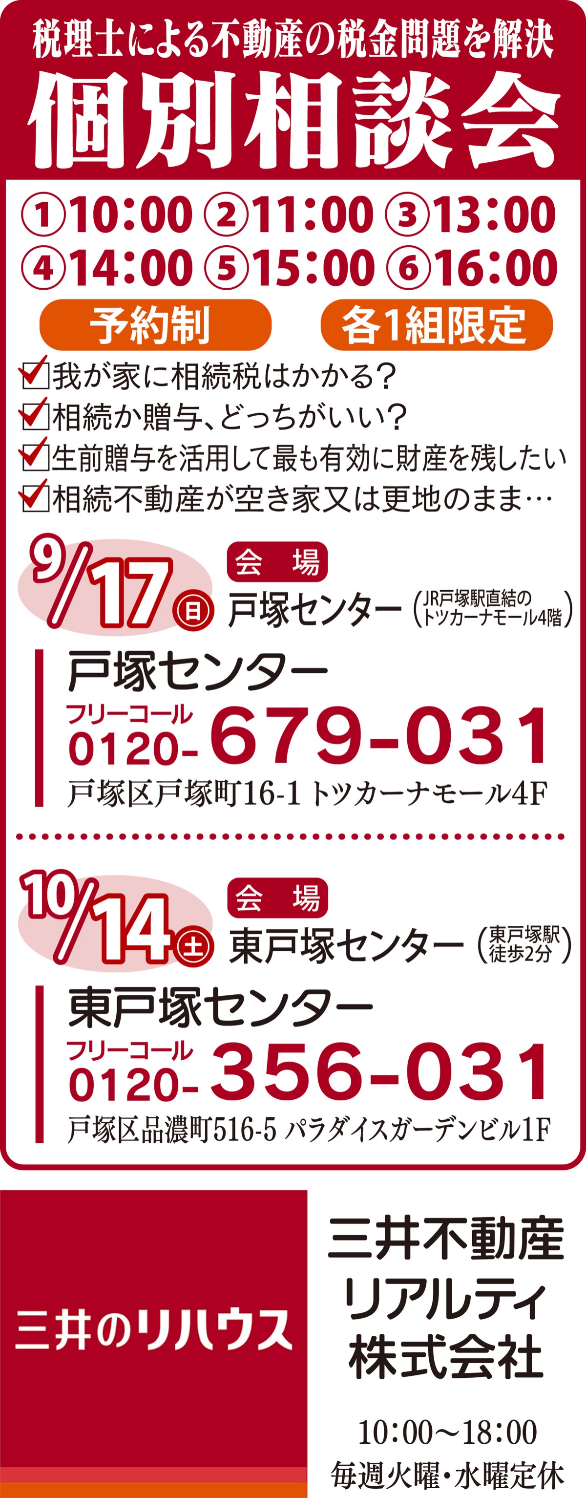 三井のリハウスの戸塚センターが9月17日(日)、東戸塚センターが10月14日(土)、不動産・相続専門の税理士を招いた個別の無料相談会を開催する=表参照。