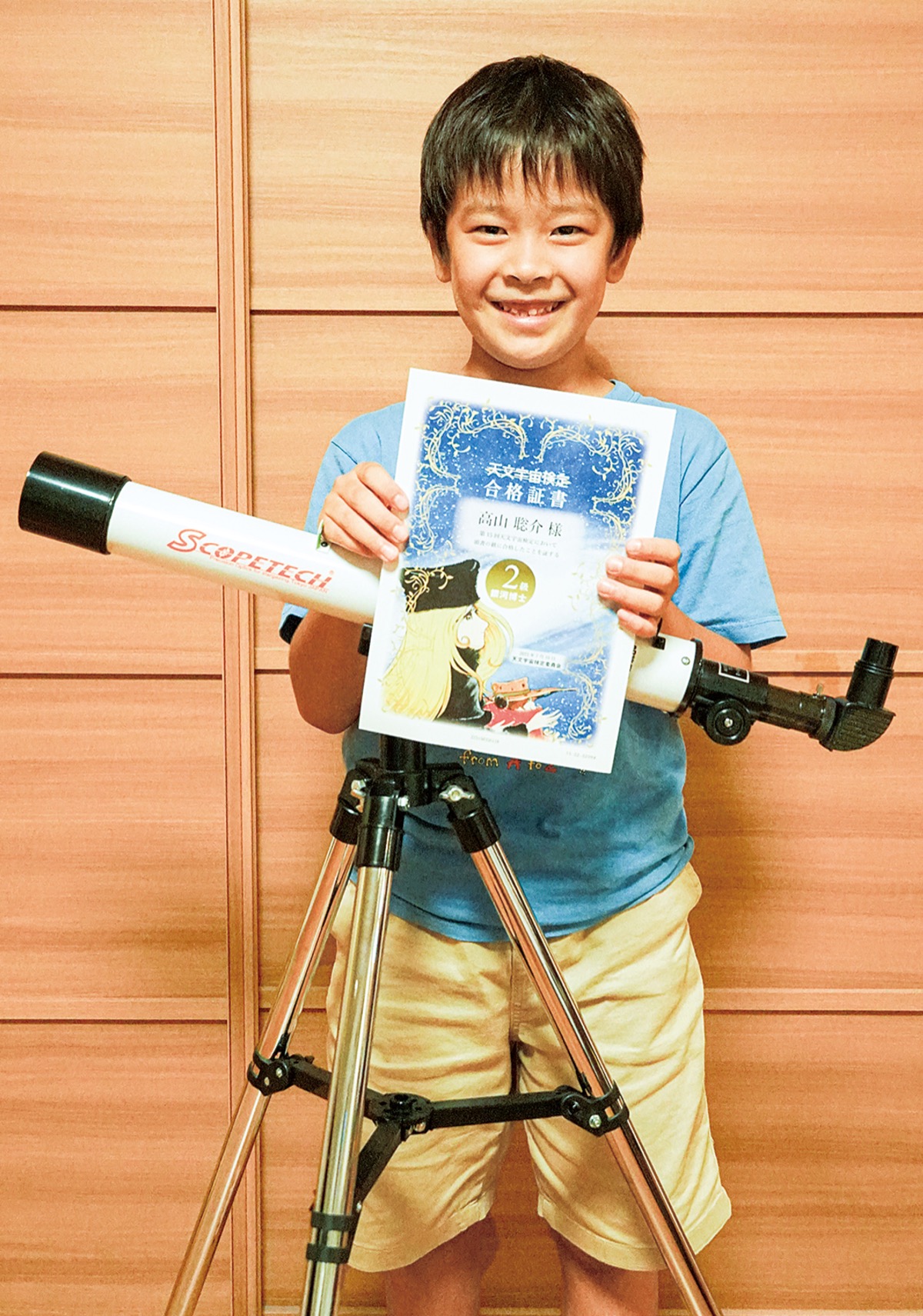 宇宙の魅力について「最新の開発とか、生命体がいるのかとか、色んな話題があって尽きない」と、高山君は目を輝かせる。昨年は山梨県の八ヶ岳で天体観測ができるペンションに出かけ、そこで天体望遠鏡を購入したり、今年は長野県阿智村でスペースXによる衛星「スターリンク」が周回する様子を観測したりと、家族もその興味を伸ばそうと後押ししている。次なる目標は、星座や天体観測を出題分野とする星空宇宙天文検定の1級合格。将来は「誰も見つけてないものを大発見してノーベル賞がとりたい」と、あくなき挑戦は続いていく。